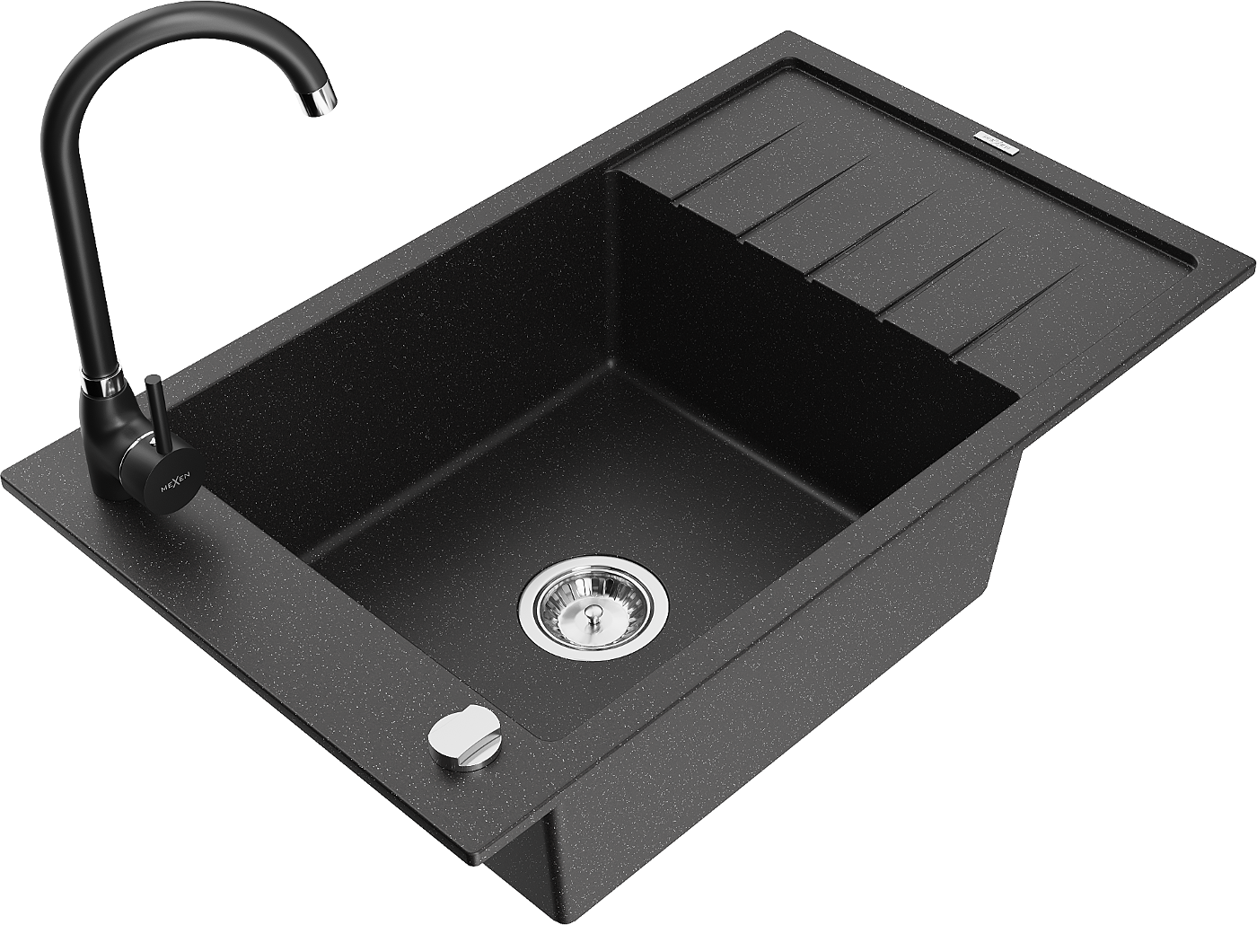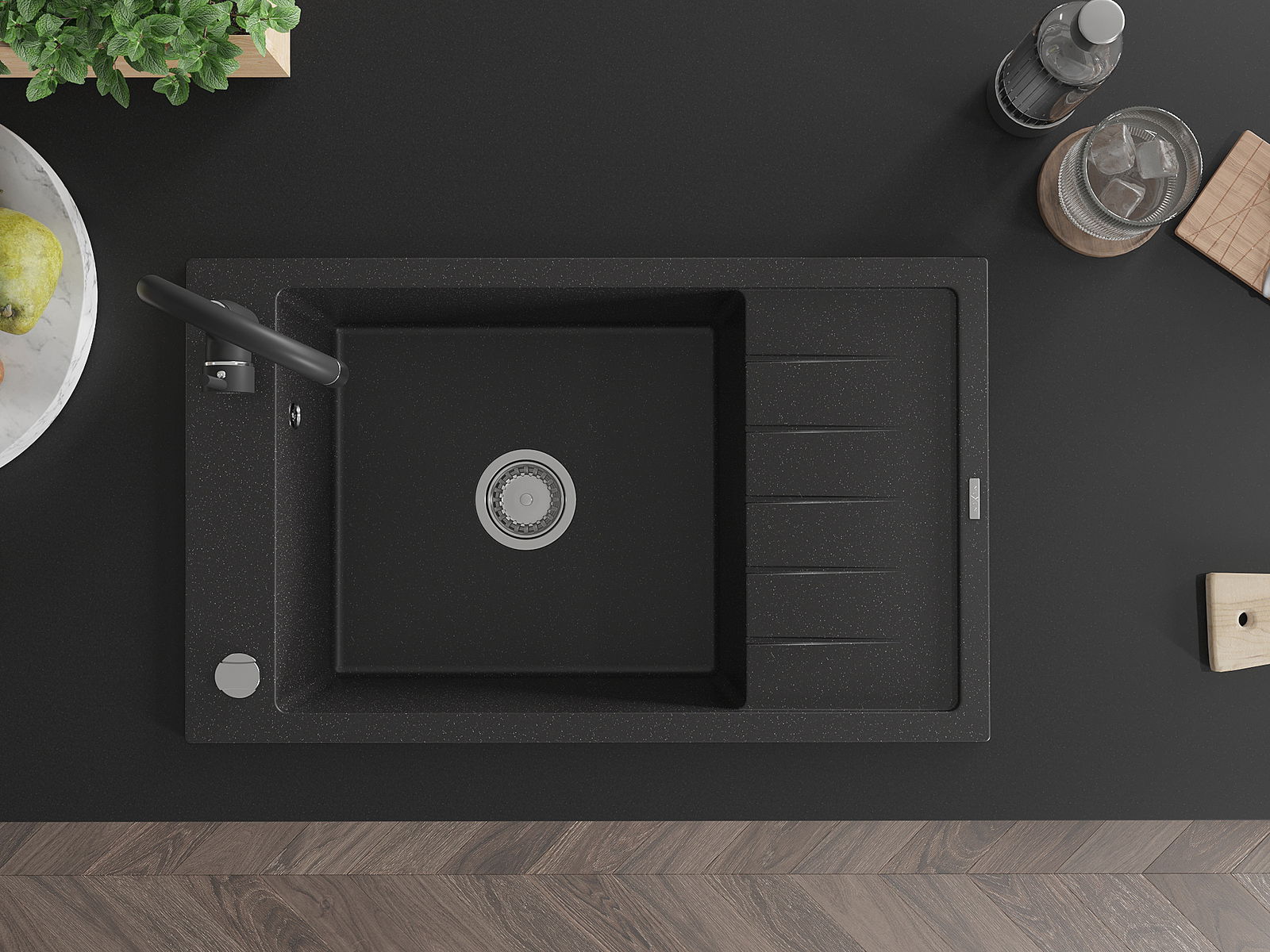 Mexen Elias egymedencés gránit mosogató csepegtetővel és Telma konyhai csappal, fekete/ezüst - 6511-73-670200-70