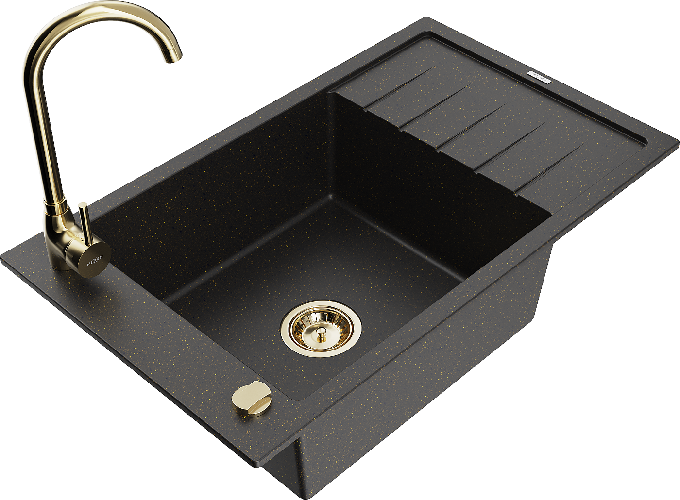 Mexen Elias egymedencés gránit mosogató csepegtetővel és Telma konyhai csappal, fekete/arany - 6511-75-670200-50