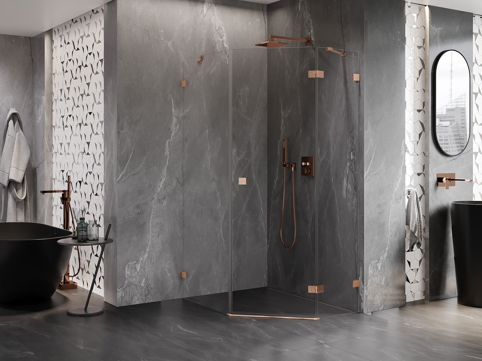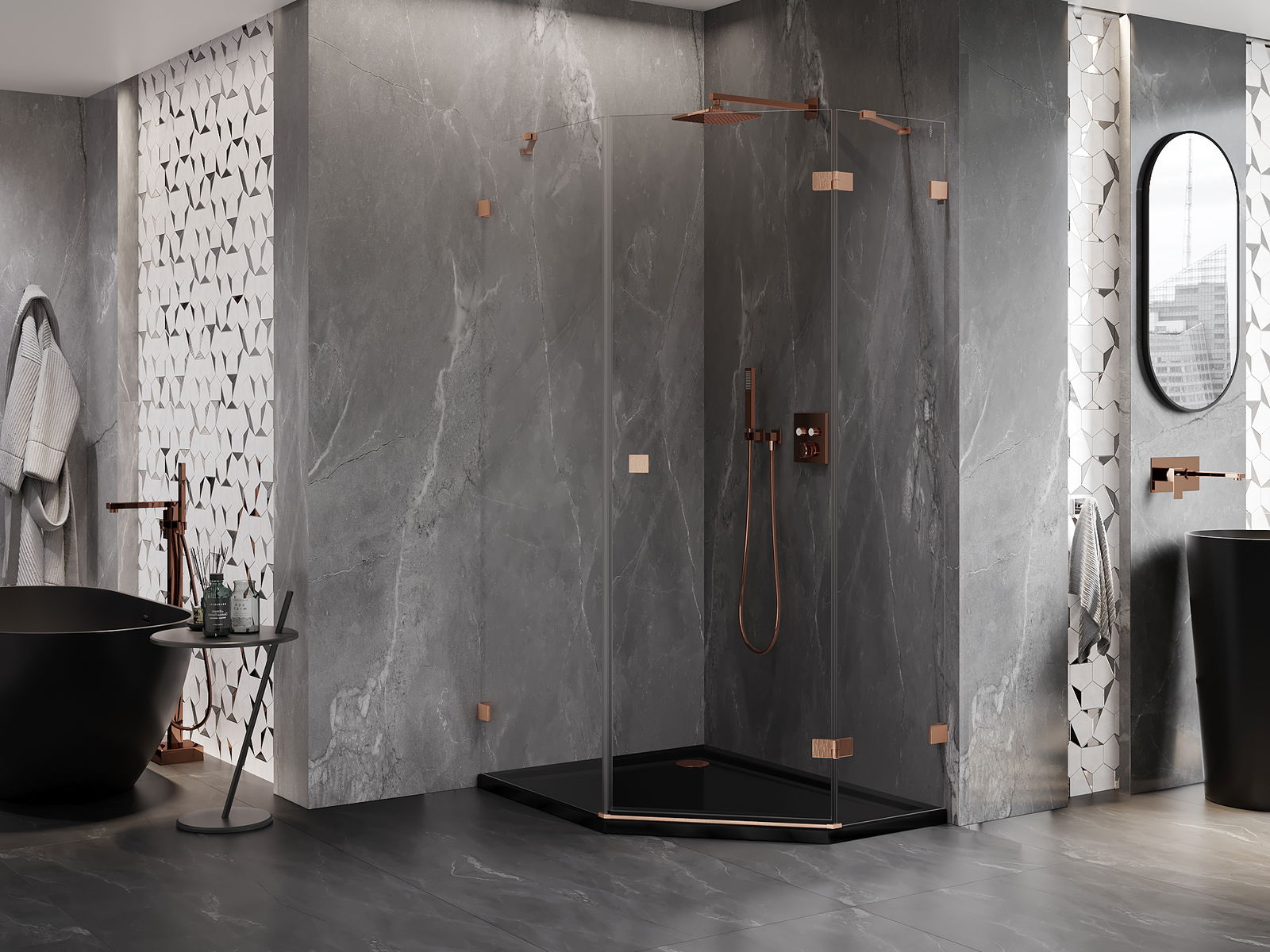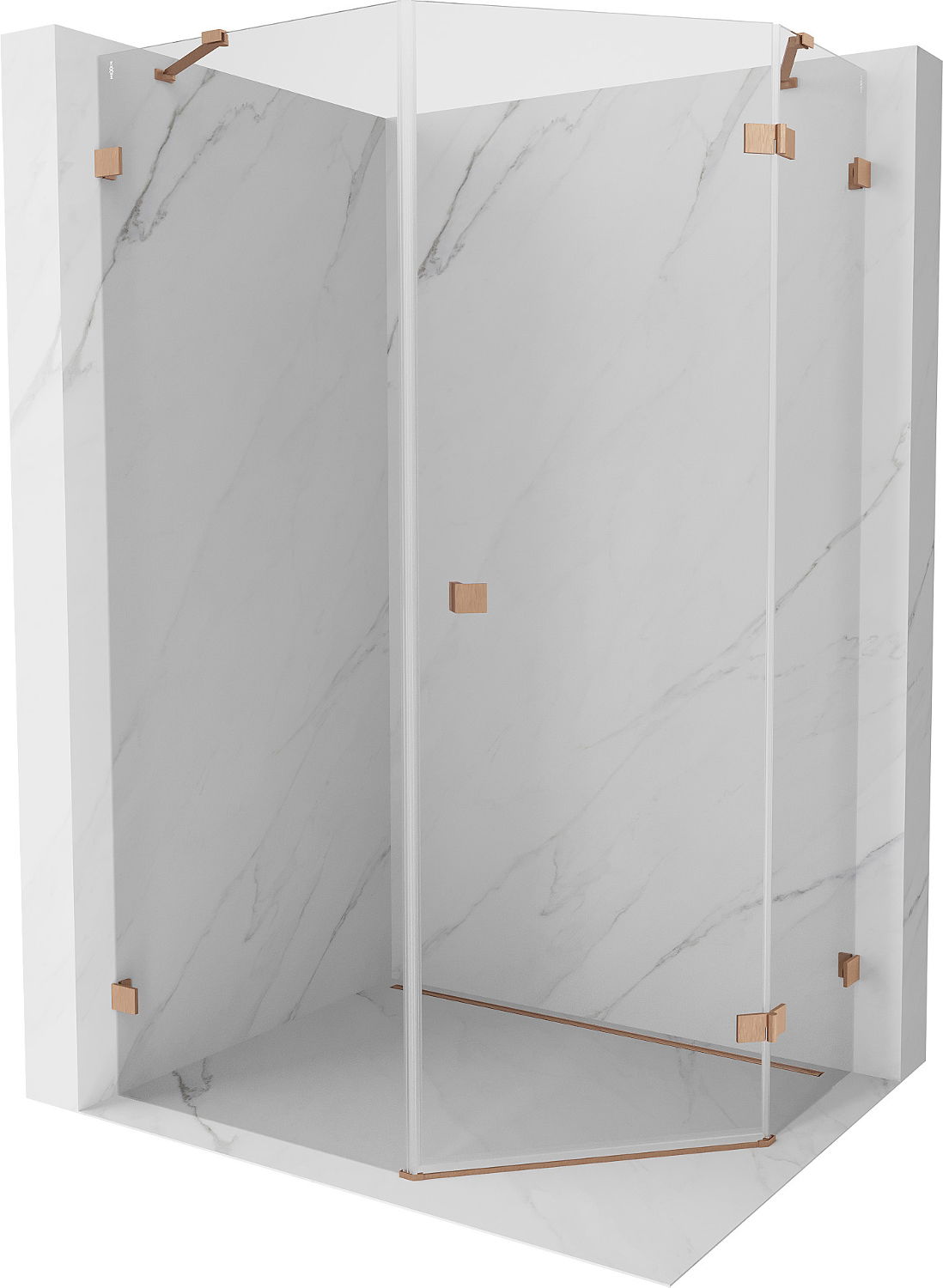 Mexen Lunar ötszögletű jobbos nyíló zuhanykabin 80 x 90 cm, átlátszó, kefe réz - 831-080P-090L-65-00-P