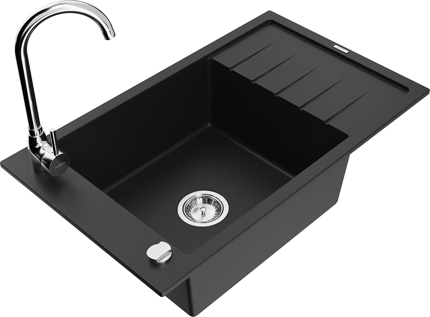 Mexen Elias gránit mosogató 1-medencés csepegtetővel és Telma konyhai csappal, fekete - 6511-77-670200-00