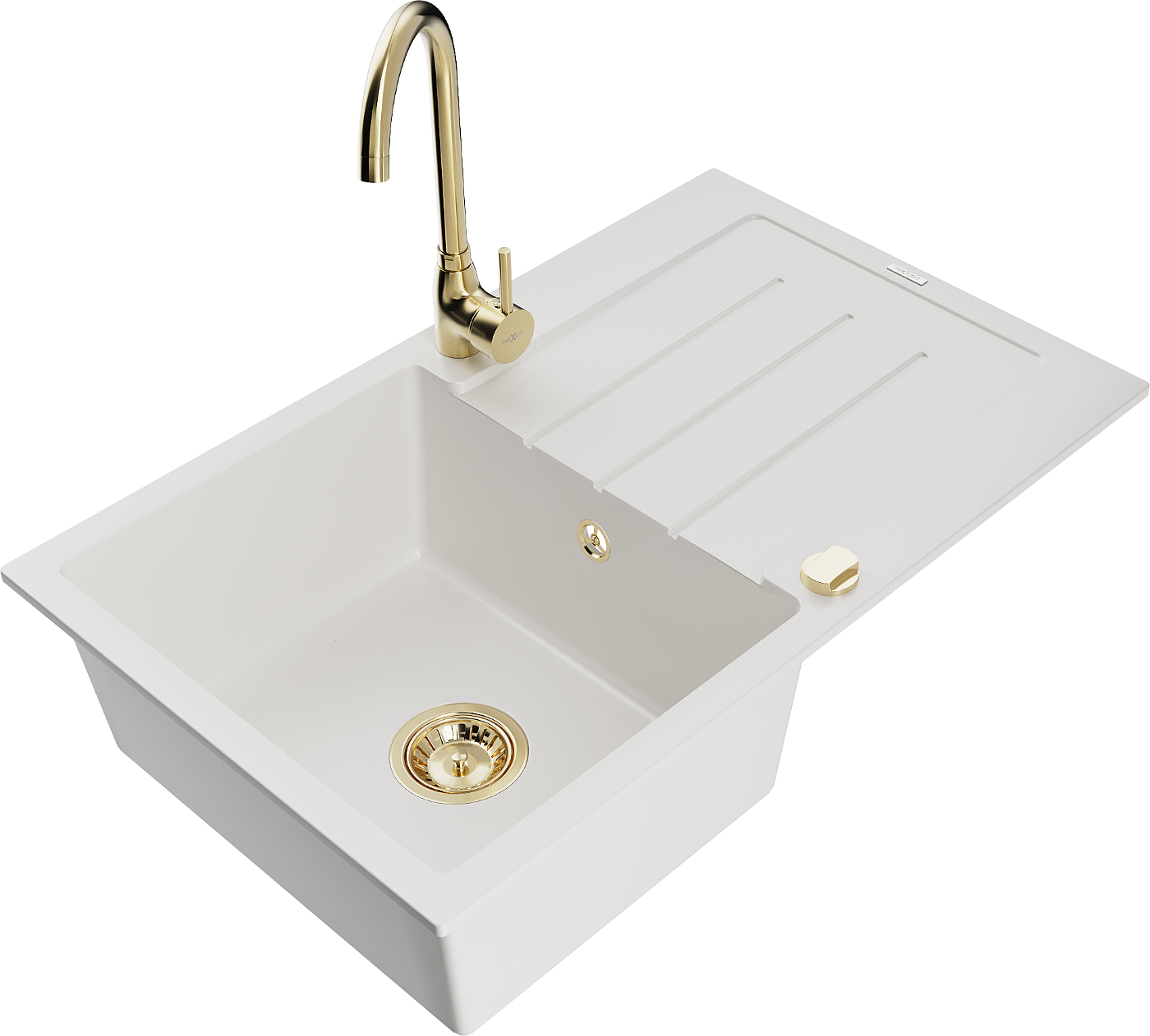 Mexen Bruno egymedencés gránit mosogatócsepegtetővel és Telma konyhai csapteleppel, fehér - 6513-20-670200-50
