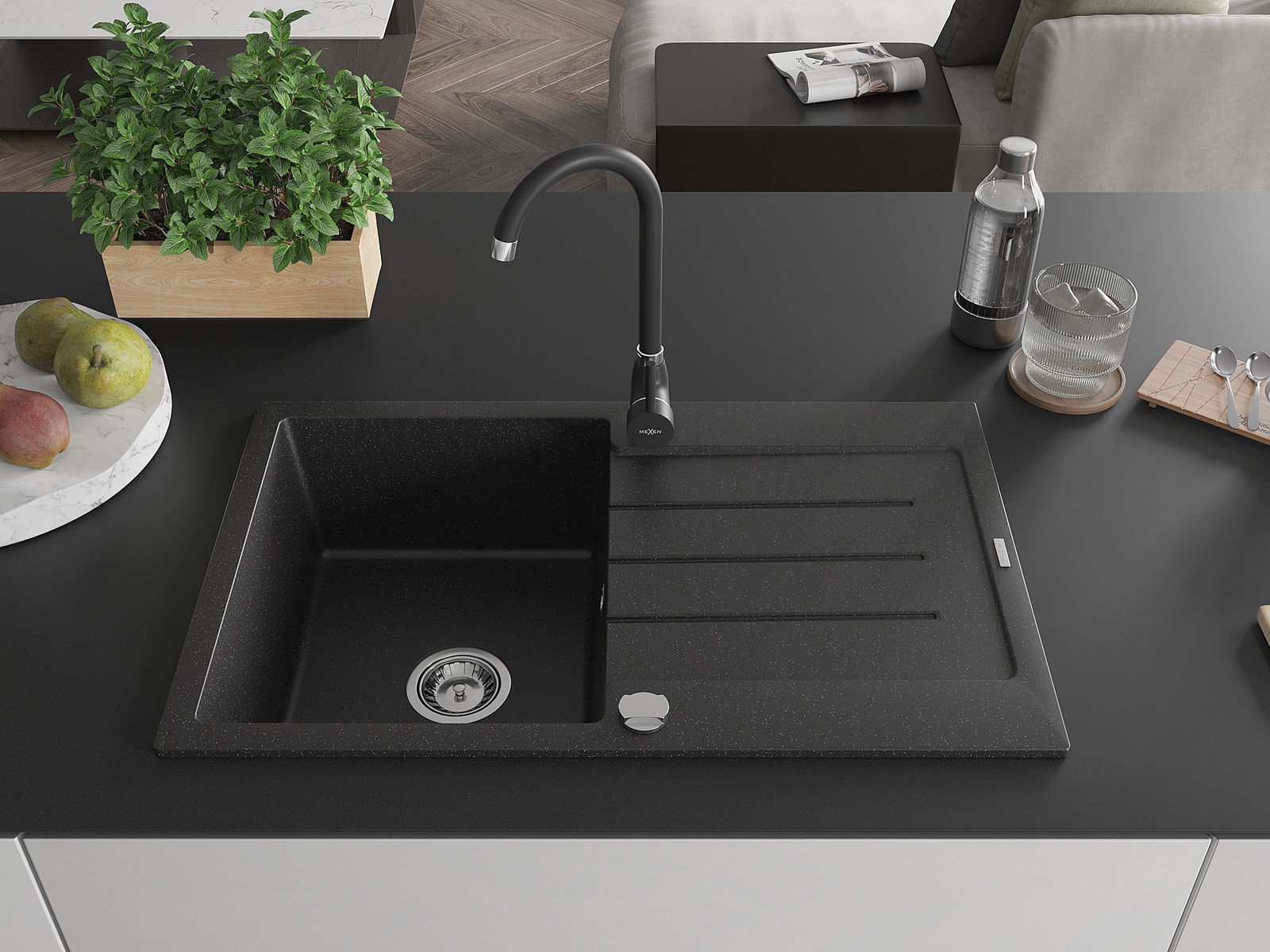 Mexen Bruno 1-medencés gránit mosogató csepegtetővel és Telma konyhai csapteleppel, fekete/ezüst - 6513-73-670200-70
