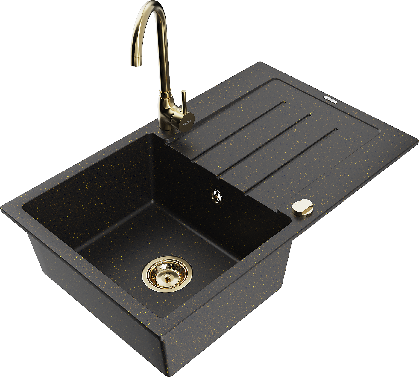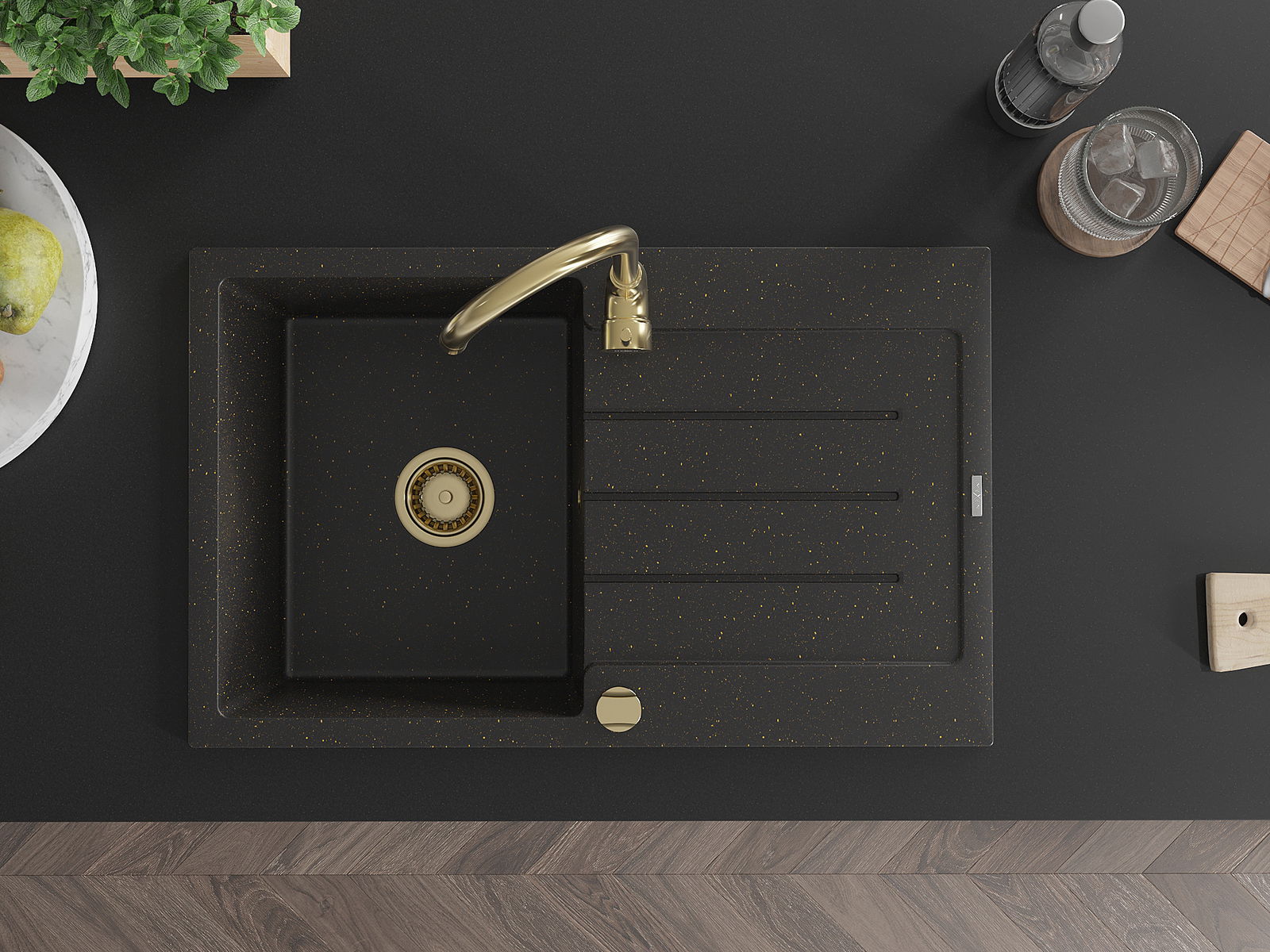 Mexen Bruno 1 rekeszes gránit mosogató csepegtetővel és Telma konyhai csapteleppel, fekete/arany - 6513-75-670200-50