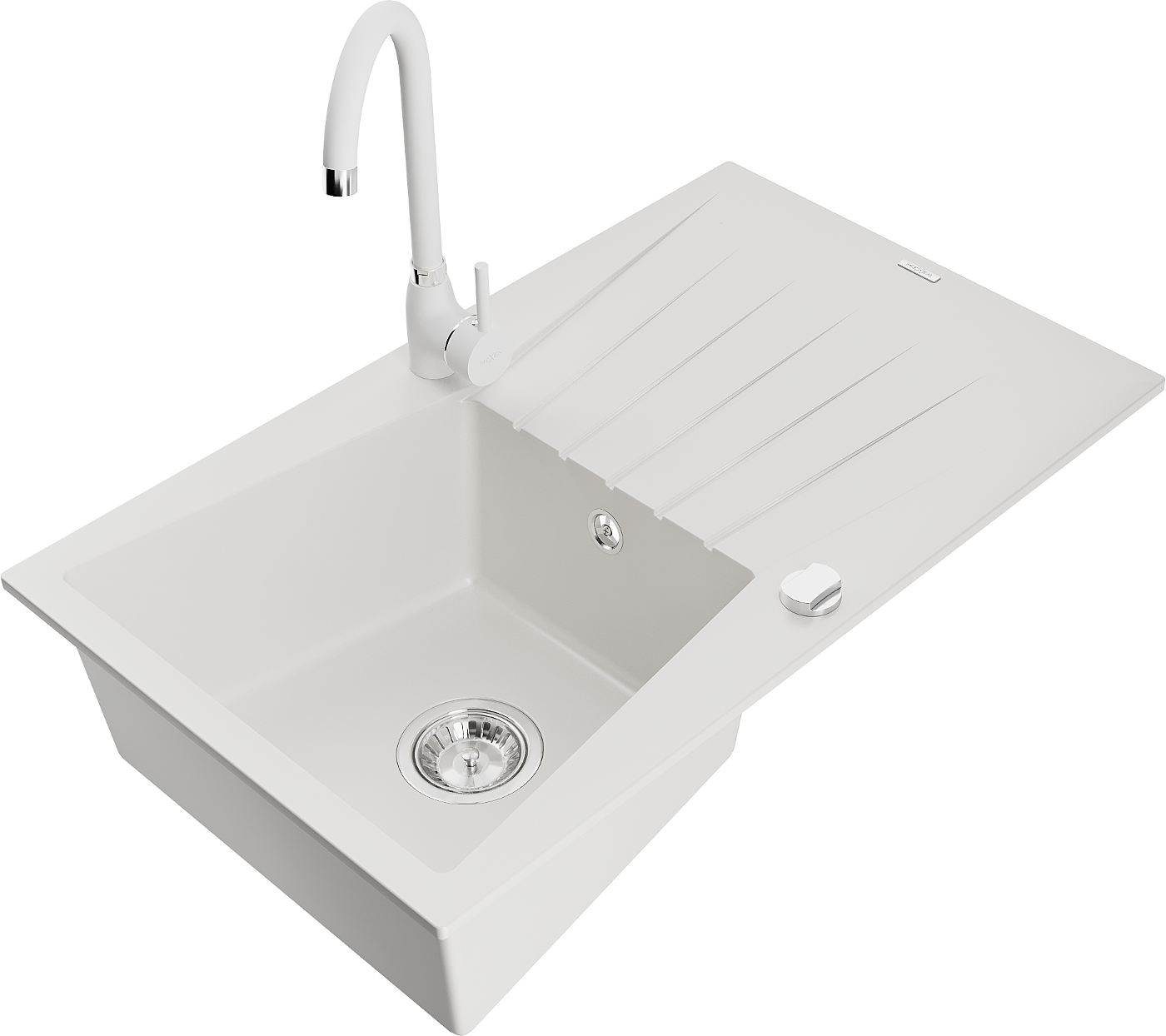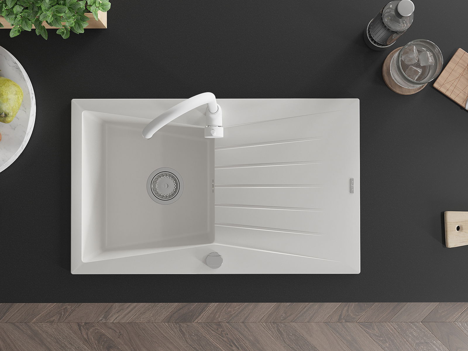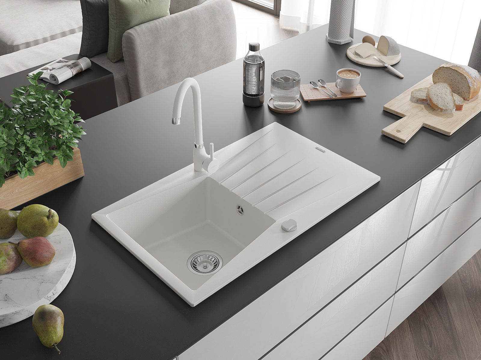 Mexen Cesar 1-medencés gránit mosogató csepegtetővel és Telma konyhai csappal, fehér - 6514-20-670200-20