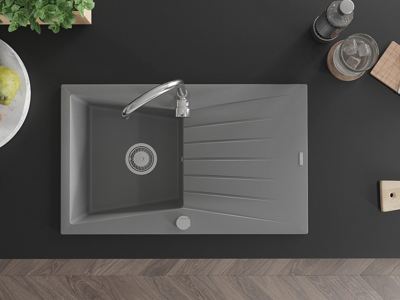 A mosogató kiváló minőségű gránitból készül. Ez egy elegáns és mindenekelőtt minden konyhához praktikus kiegészítés, stílusától függetlenül. A kiváló minőségű és a gránit tartósság biztosítja a sok éves használatát.