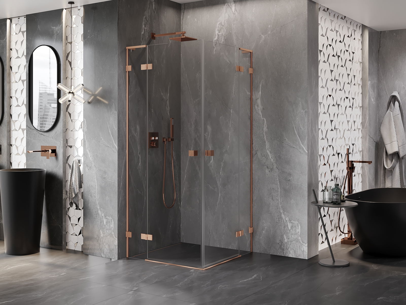Mexen Lunar L Duo nyíló zuhanykabin 100 x 100 cm, átlátszó, csiszolt réz - 834L-100L-100P-65-00