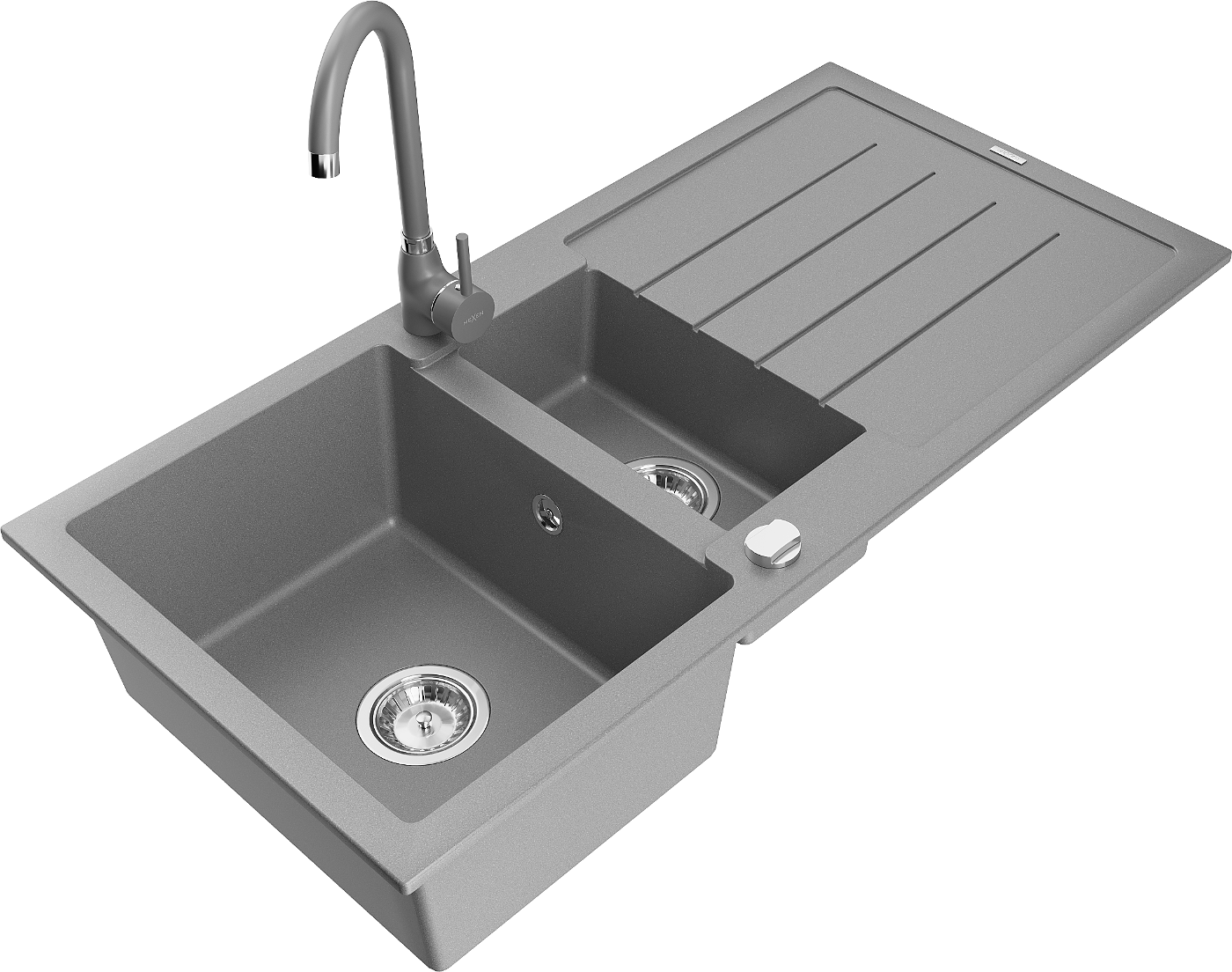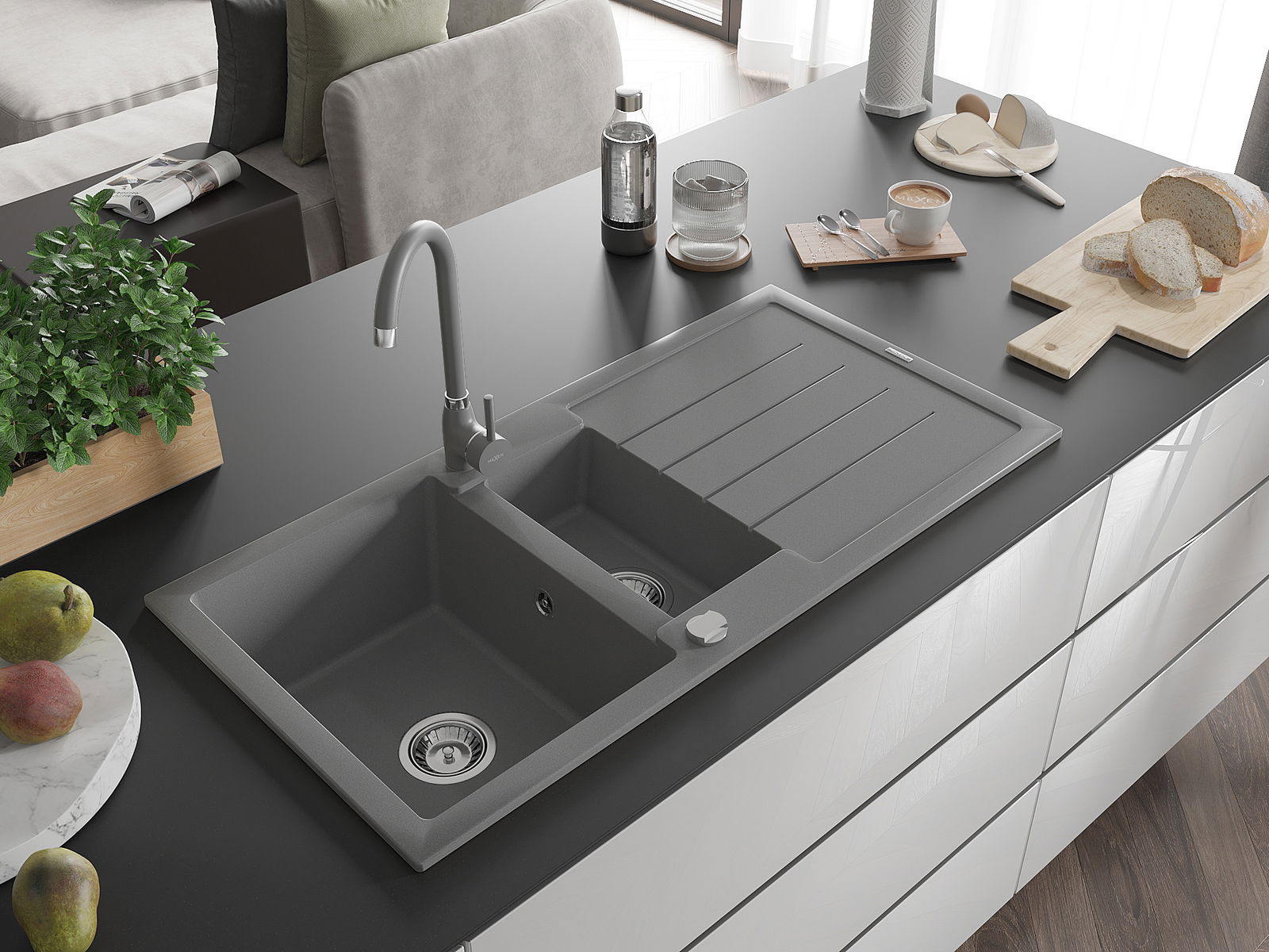 Mexen Andres gránit mosogatótál 1,5 rekeszes csepegtetővel és Telma konyhai csapteleppel, szürke - 6515-71-670200-71