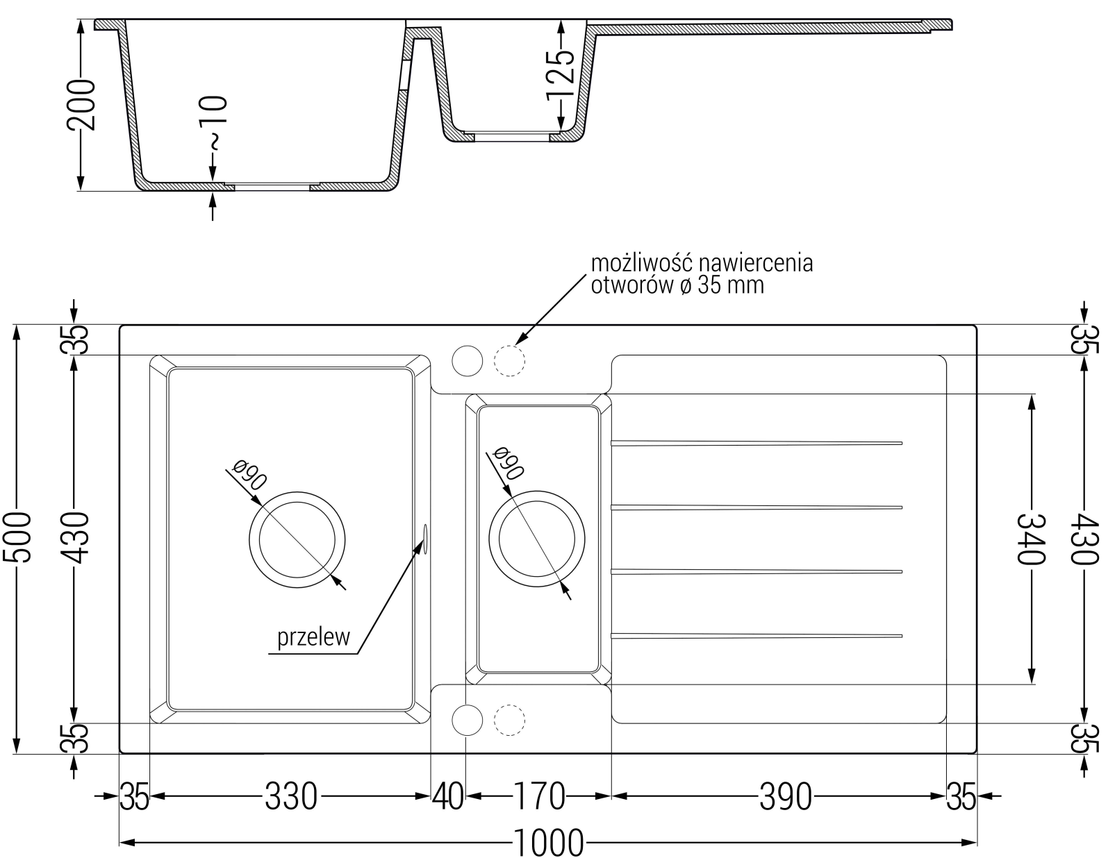 A mosogató 2 előfúrt, 35 mm átmérőjű nyílással rendelkezik, amelyeket saját kezűleg lehet kivágni. Ezek többek között felhasználhatók folyékony adagoló felszerelésére, amely megszünteti a műanyag palackok jelenlétét a konyhában, és elegáns befejezést kölcsönöz neki.