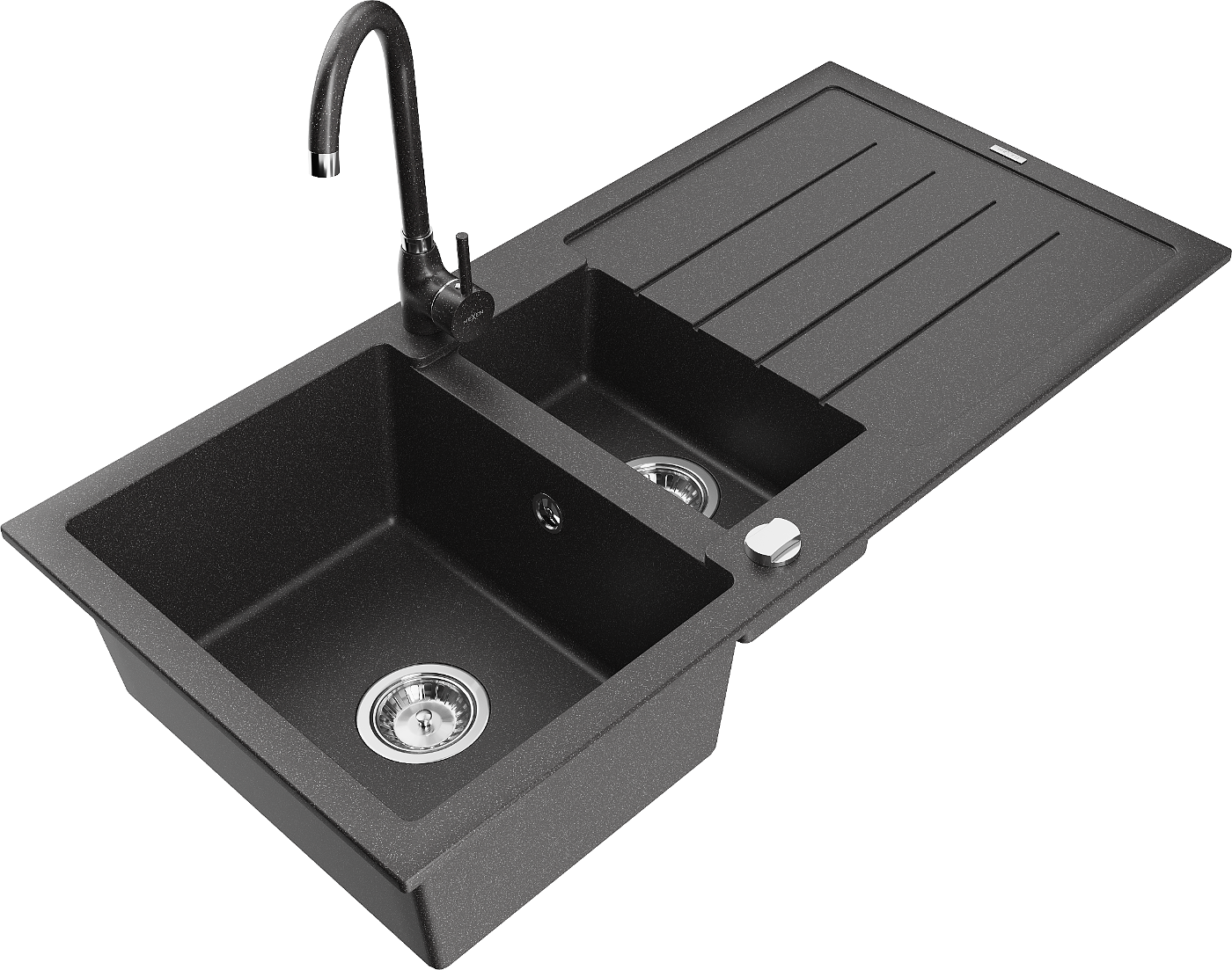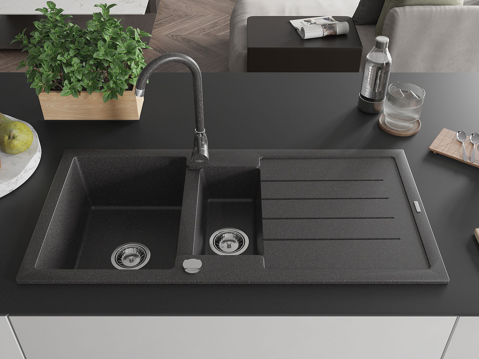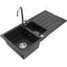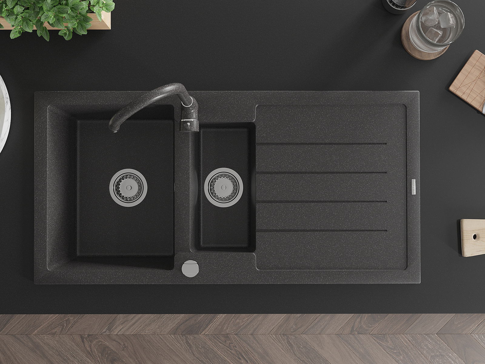 Mexen Andres 1,5 medencés gránit mosogató csepegtetővel és Telma konyhai csapteleppel, fekete leszórt - 6515-76-670200-76