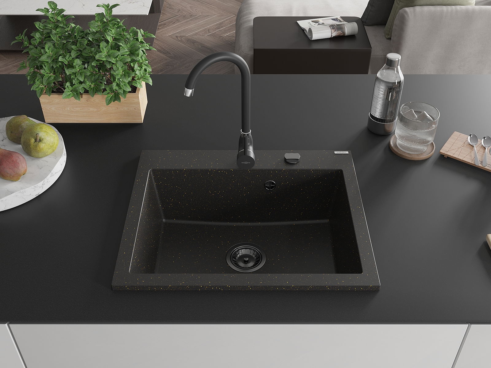 Mexen Elix 1-medencés gránit mosogató 600 x 500 mm, fekete/arany metál, fekete szifon - 6525601005-75-B