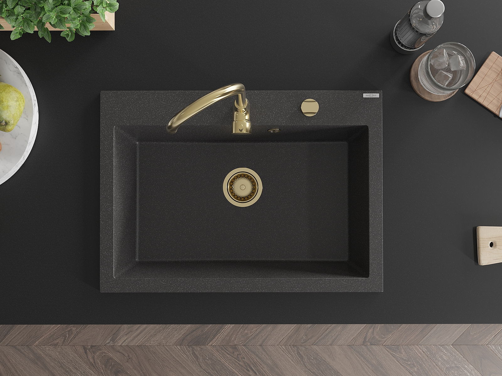 Mexen Elix egymedencés gránit mosogató 700 x 500 mm, fekete pöttyös, arany szifonnal - 6526701005-76-G