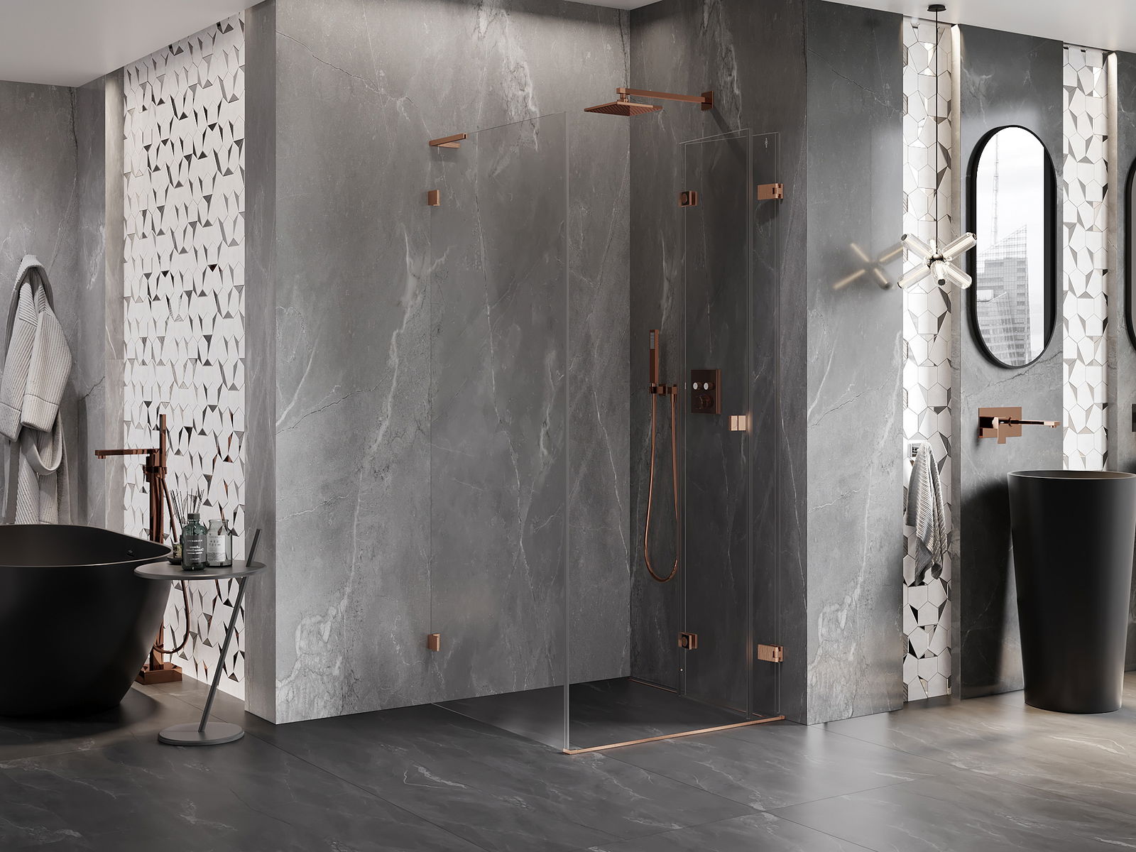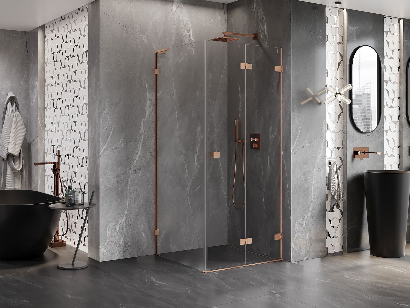 A praktikus és kényelmes fogantyú tartós és ellenálló fémből készült. A divatos forma a profilok színéhez igazított kivitelezéssel együtt modern és stílusos megjelenést kölcsönöz az egésznek, kiemelve minden fürdőszoba esztétikáját.