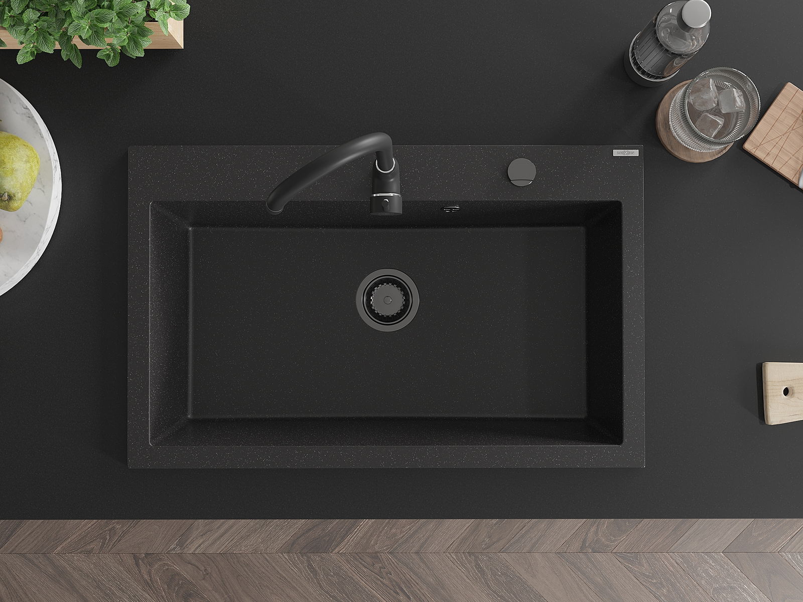 Mexen Elix gránit mosogató 1-medencés 800 x 500 mm, fekete/ezüst metál, fekete szifon - 6527801005-73-B