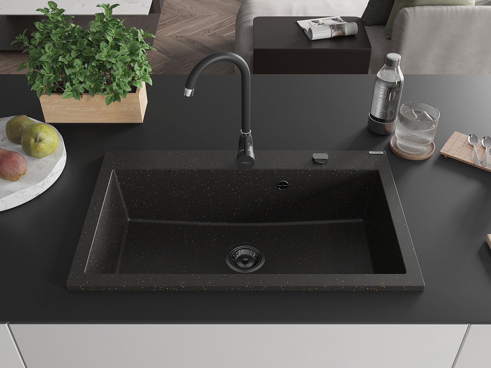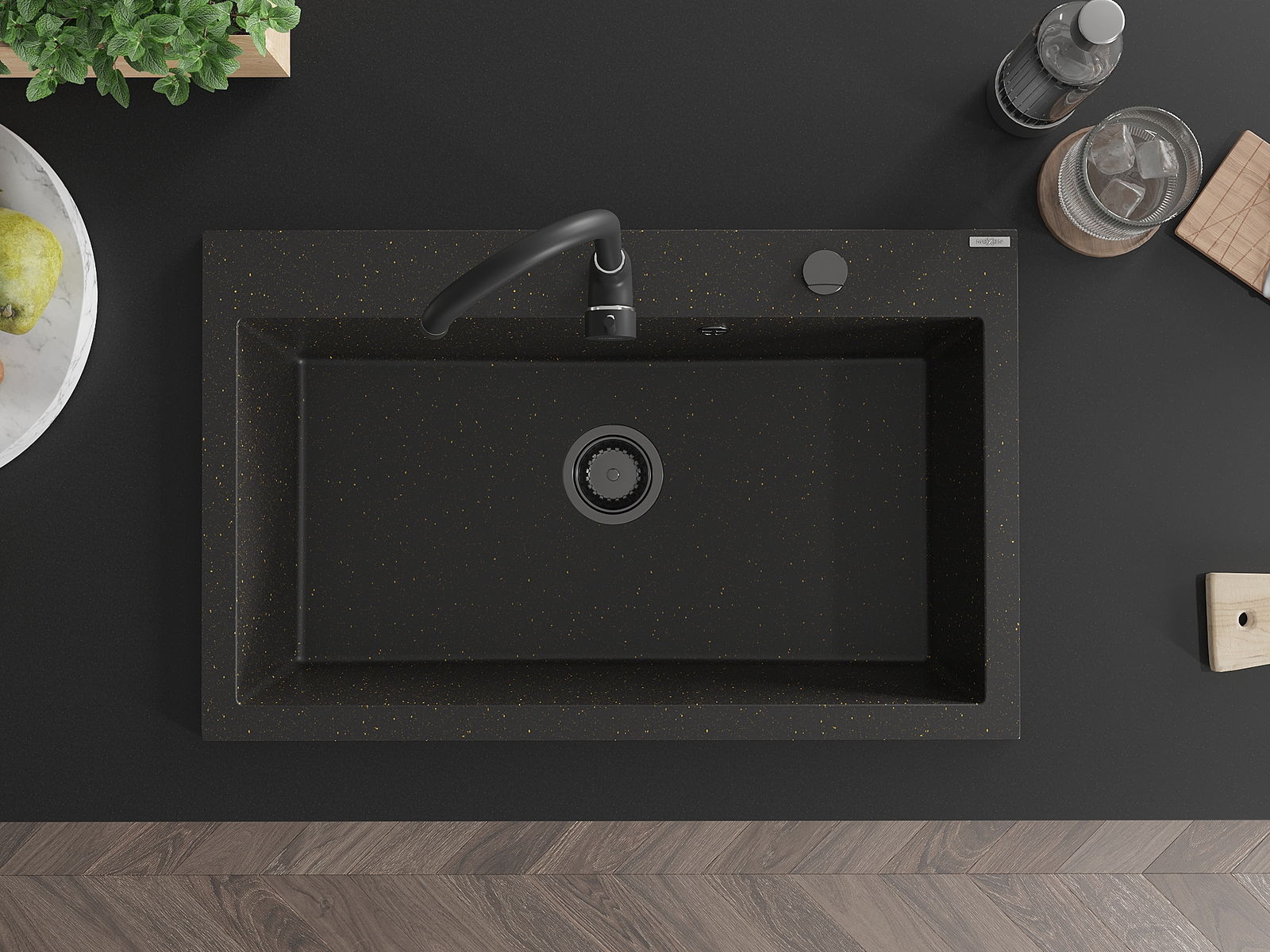 Mexen Elix gránit mosogató 1 medencés 800 x 500 mm, fekete/arany metál, fekete szifon - 6527801005-75-B