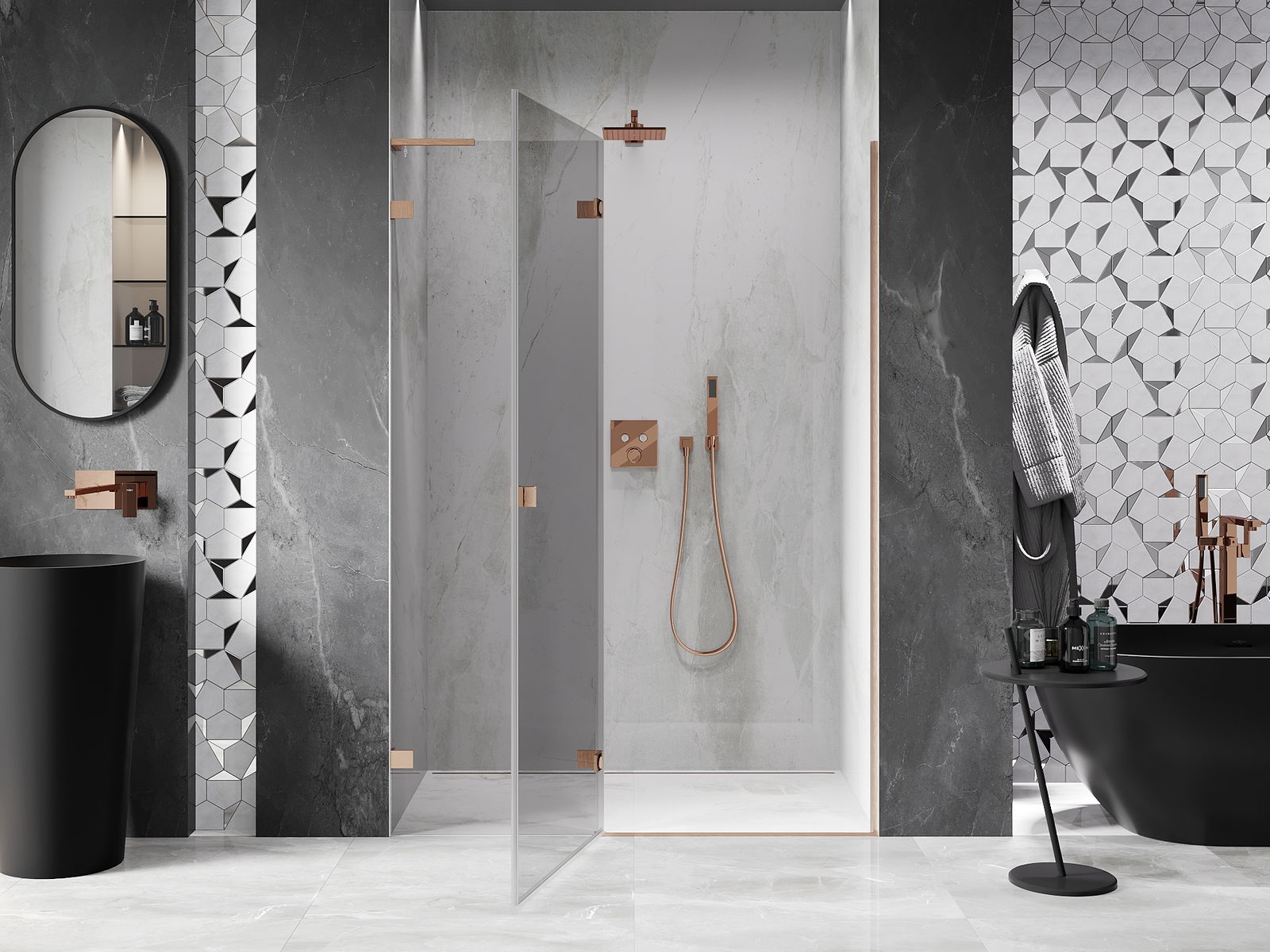 A praktikus és kényelmes fogantyú tartós és ellenálló fémből készült. A divatos forma a profilok színéhez igazított kivitelezéssel együtt modern és stílusos megjelenést kölcsönöz az egésznek, kiemelve minden fürdőszoba esztétikáját.
