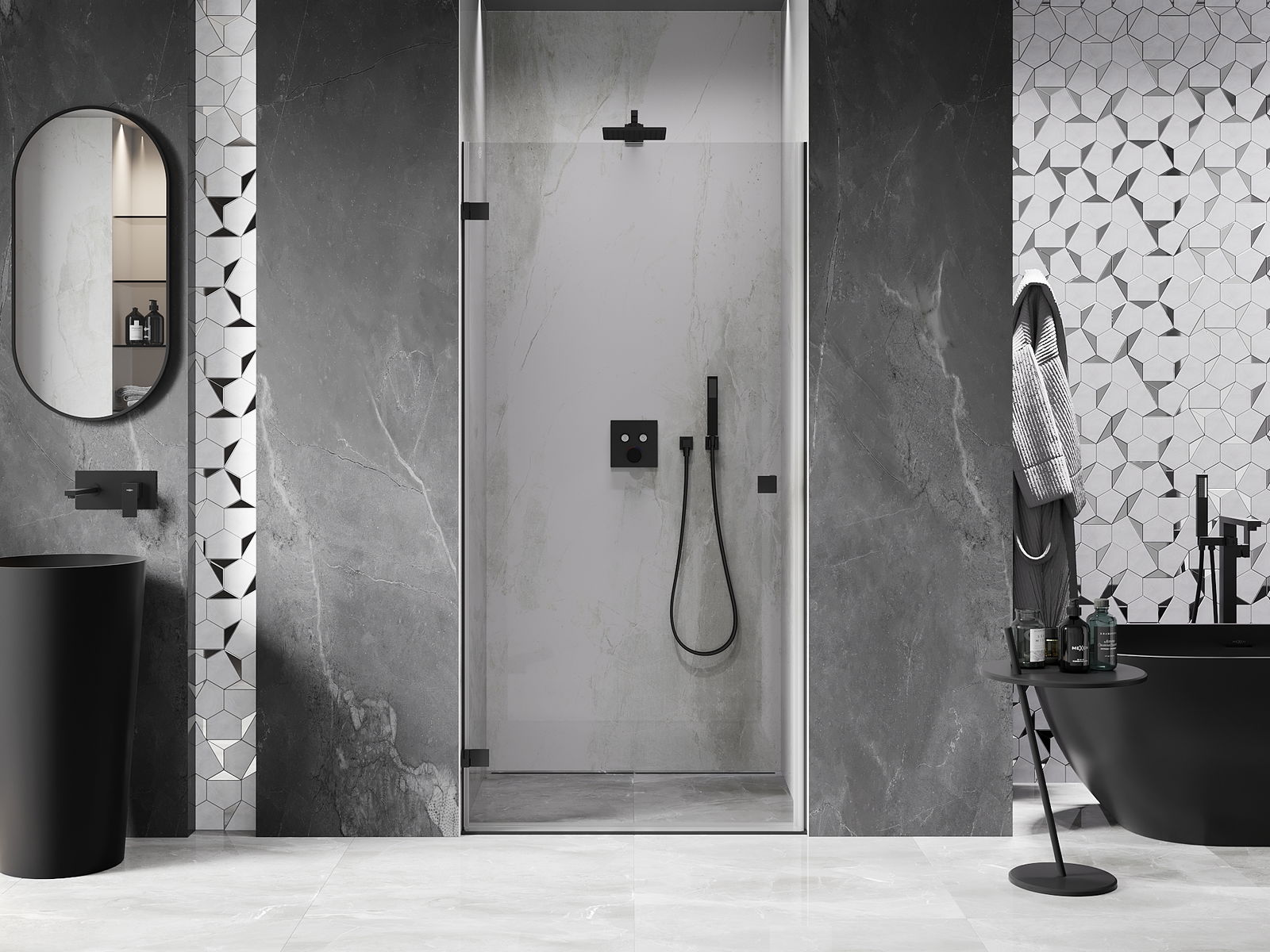 A praktikus és kényelmes fogantyú tartós és ellenálló fémből készült. A divatos forma a profilok színéhez igazított kivitelezéssel együtt modern és stílusos megjelenést kölcsönöz az egésznek, kiemelve minden fürdőszoba esztétikáját.