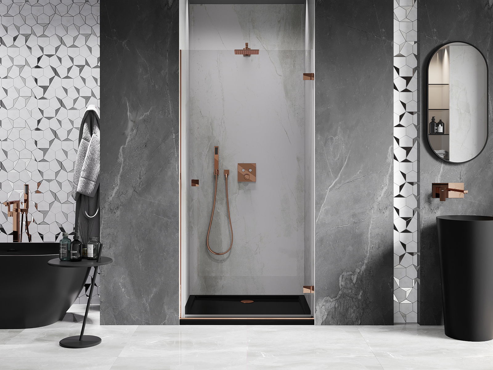 A praktikus és kényelmes fogantyú tartós és ellenálló fémből készült. A divatos forma a profilok színéhez igazított kivitelezéssel együtt modern és stílusos megjelenést kölcsönöz az egésznek, kiemelve minden fürdőszoba esztétikáját.
