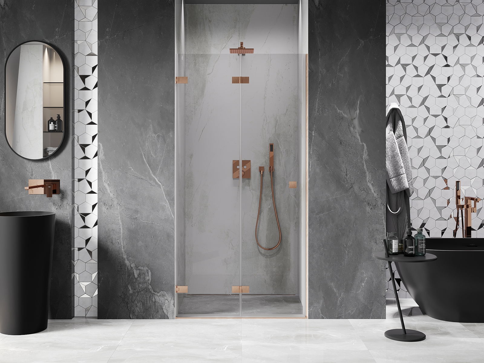 A praktikus és kényelmes fogantyú tartós és ellenálló fémből készült. A divatos forma a profilok színéhez igazított kivitelezéssel együtt modern és stílusos megjelenést kölcsönöz az egésznek, kiemelve minden fürdőszoba esztétikáját.