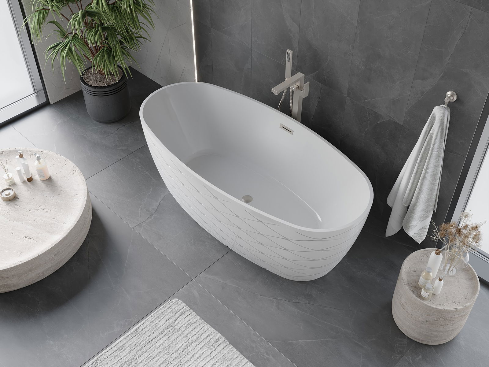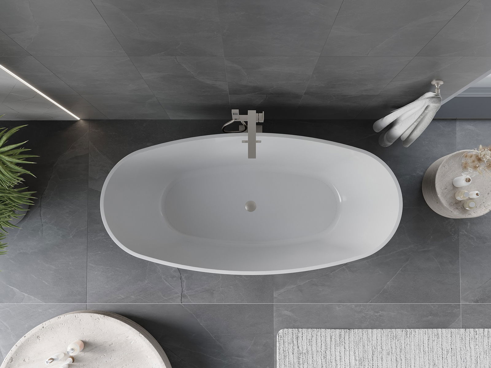 Ez egy modern anyag, amely elegáns megjelenést ötvöz a magas tartóssággal. Ellenáll a mechanikai sérüléseknek, könnyen tisztítható és kellemes tapintású. Az áttetsző forma és a vékony perem könnyedséget és egyedi karaktert kölcsönöz a kádnak, látványos hangsúlyt adva a fürdőszoba kialakításában.