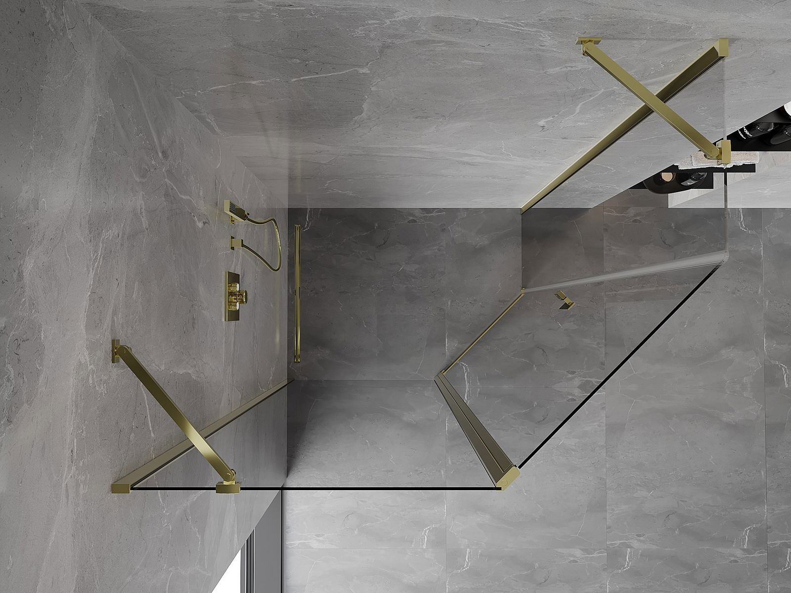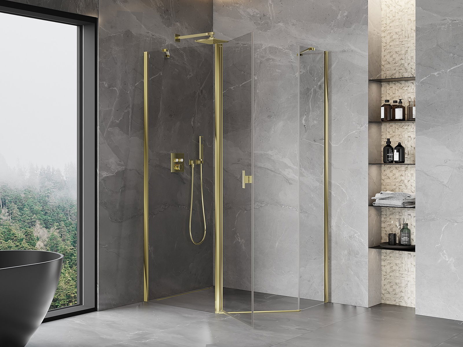 Mexen Mist ötszögletű aszimmetrikus zuhanykabin nyíló ajtóval, 100 x 90 cm, átlátszó, arany - 8A8-100-090-50-00