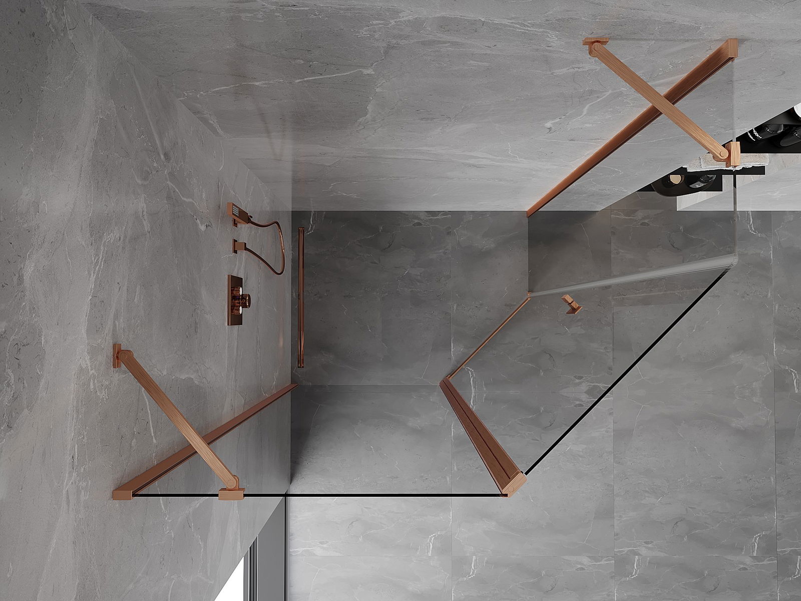 Mexen Mist ötszögletű, aszimmetrikus zuhanykabin, nyíló, 90 x 80 cm, átlátszó, csiszolt réz - 8A8-090-080-65-00