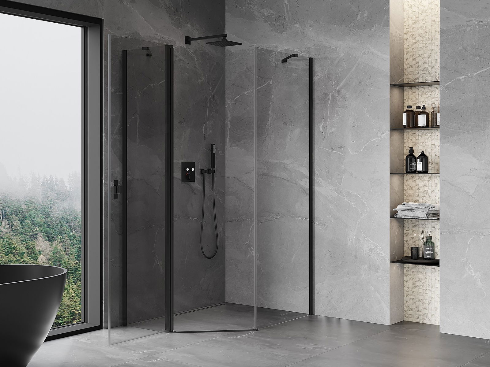 Mexen Mist ötszögletű aszimmetrikus zuhanykabin, lenyitható, 80 x 90 cm, átlátszó, fekete - 8A8-080-090-70-00