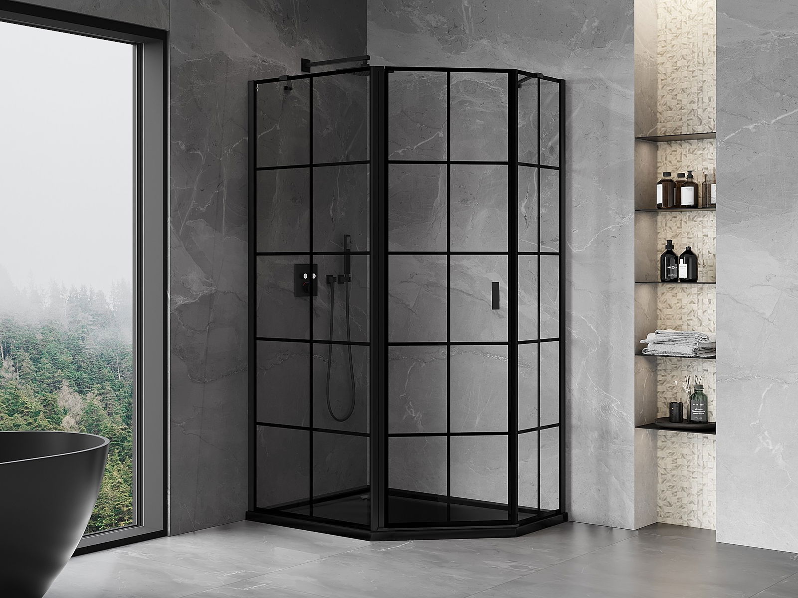 Mexen Mist ötszög alakú aszimmetrikus balos zuhanykabin 100 x 90 cm, fekete rács, fekete - 8A8-100-090-70-77-L