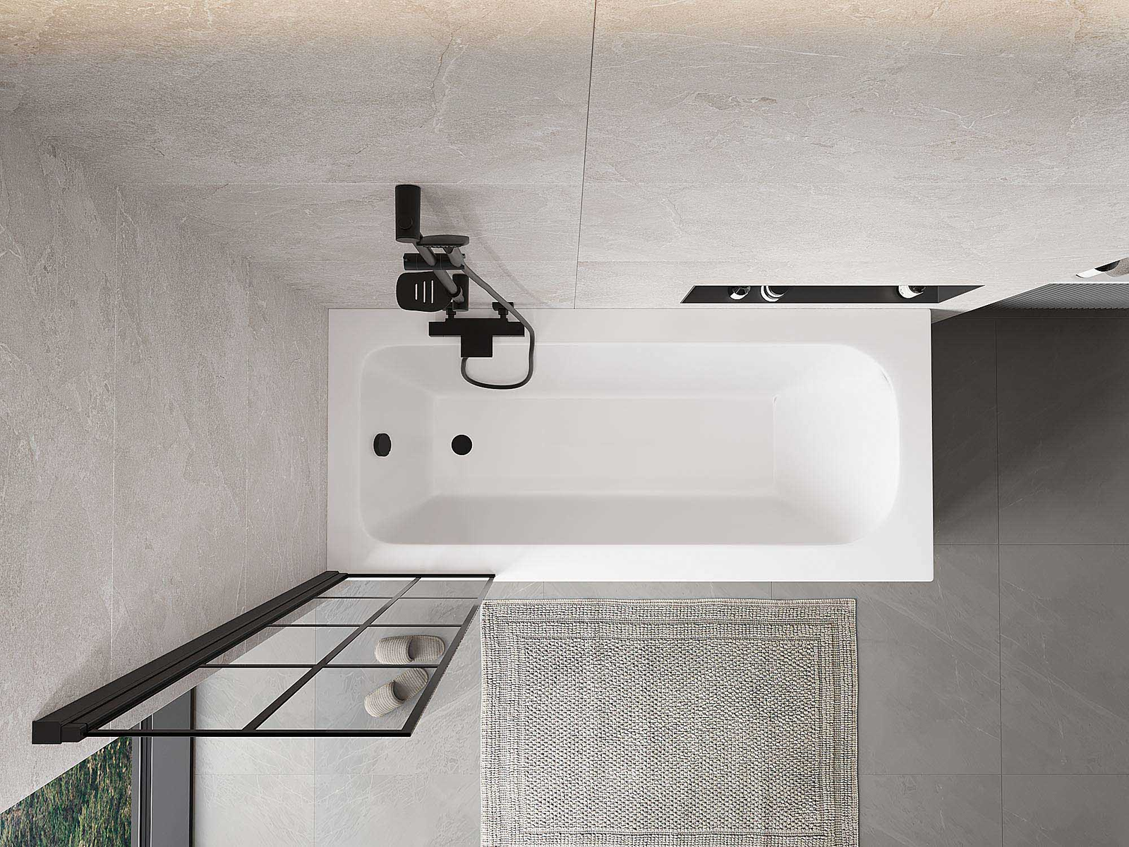 Két szárnyból készült paraván, amely összecsukható. Ez a megoldás több helyet takarít meg a fürdőszobában, és lehetővé teszi a fennmaradó tér szabad használatát, amikor nem használjuk a fürdőrészt.