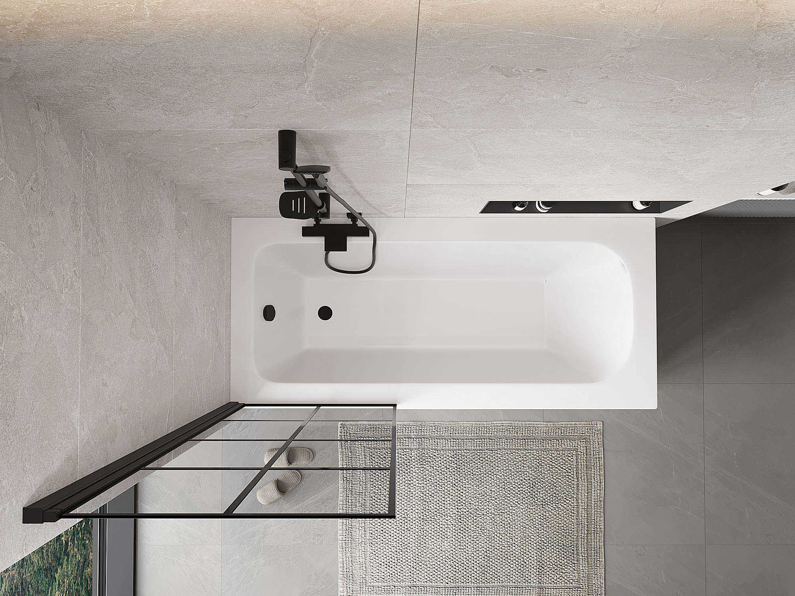 Két szárnyból készült paraván, amely összecsukható. Ez a megoldás több helyet takarít meg a fürdőszobában, és lehetővé teszi a fennmaradó tér szabad használatát, amikor nem használjuk a fürdőrészt.