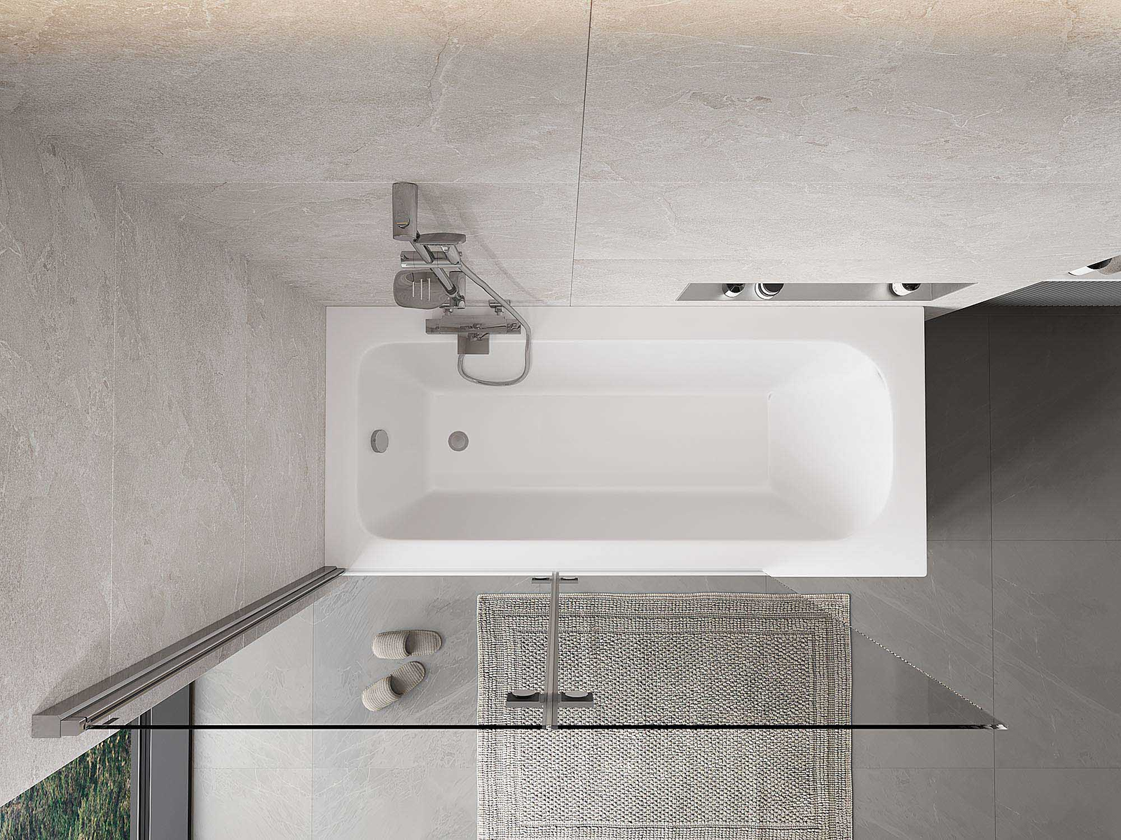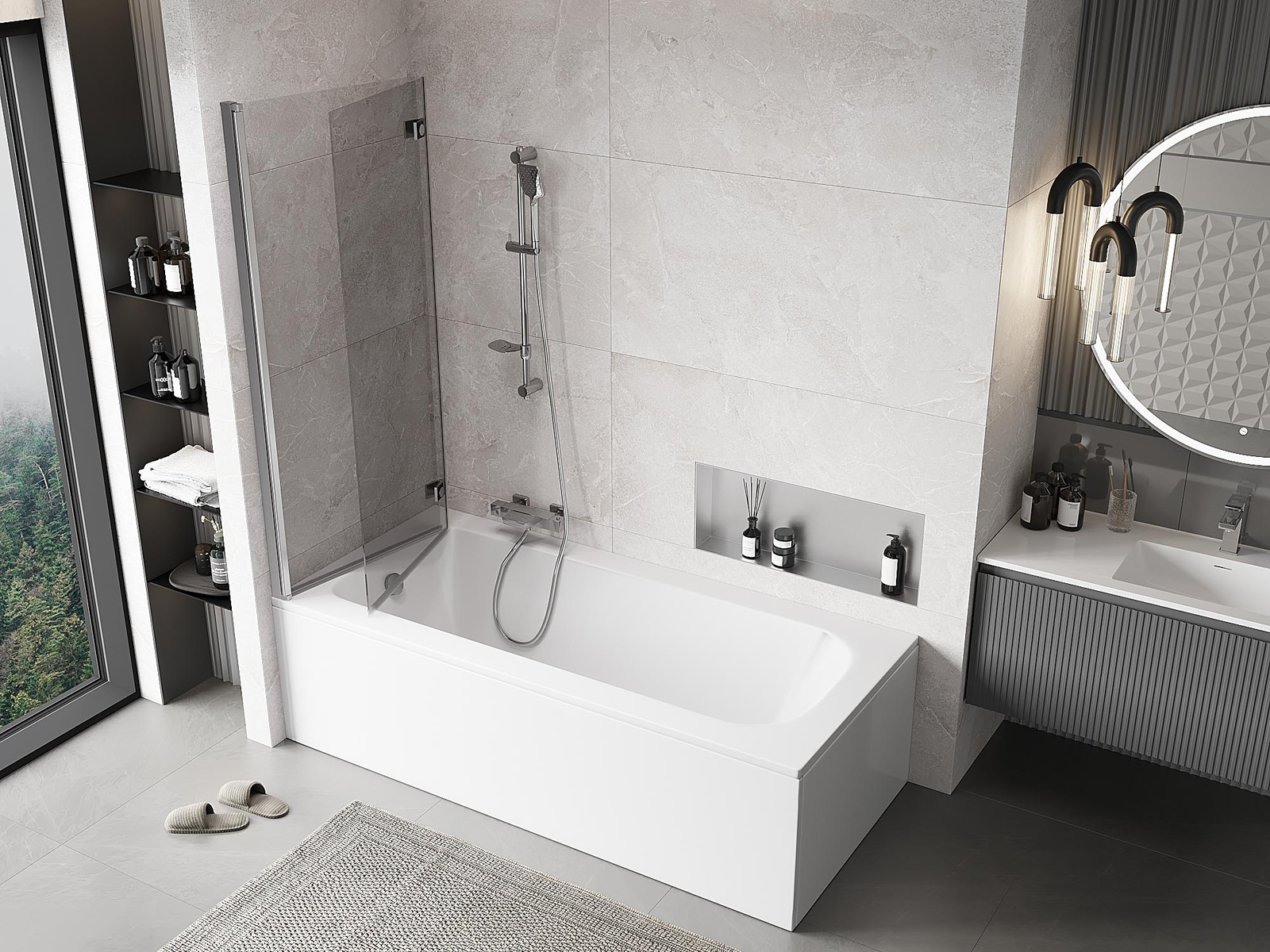 Két szárnyból készült paraván, amely összecsukható. Ez a megoldás több helyet takarít meg a fürdőszobában, és lehetővé teszi a fennmaradó tér szabad használatát, amikor nem használjuk a fürdőrészt.