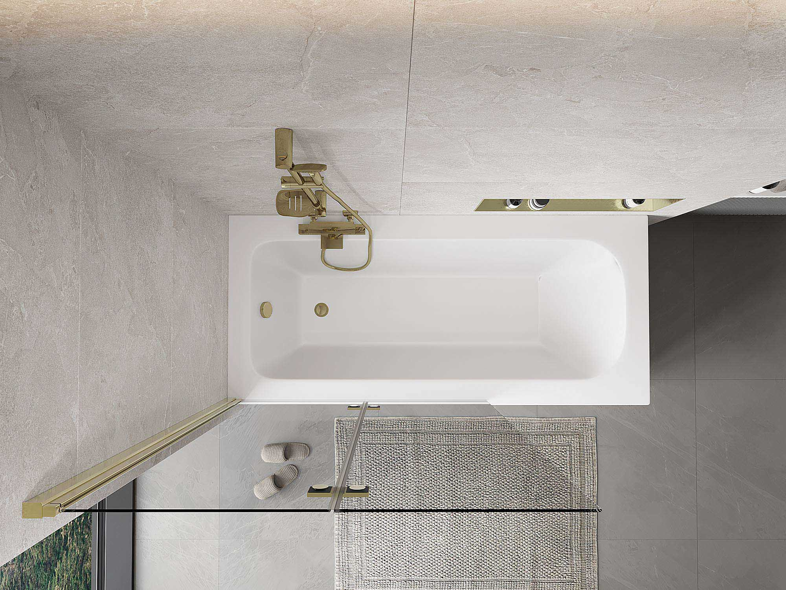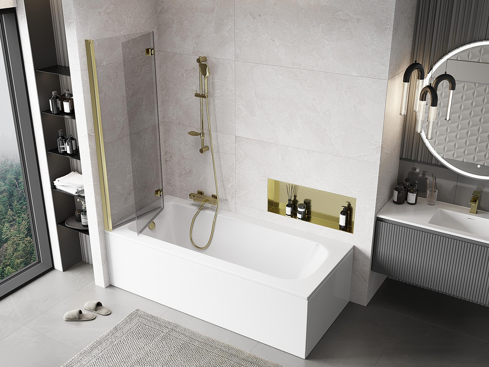 Két szárnyból készült paraván, amely összecsukható. Ez a megoldás több helyet takarít meg a fürdőszobában, és lehetővé teszi a fennmaradó tér szabad használatát, amikor nem használjuk a fürdőrészt.