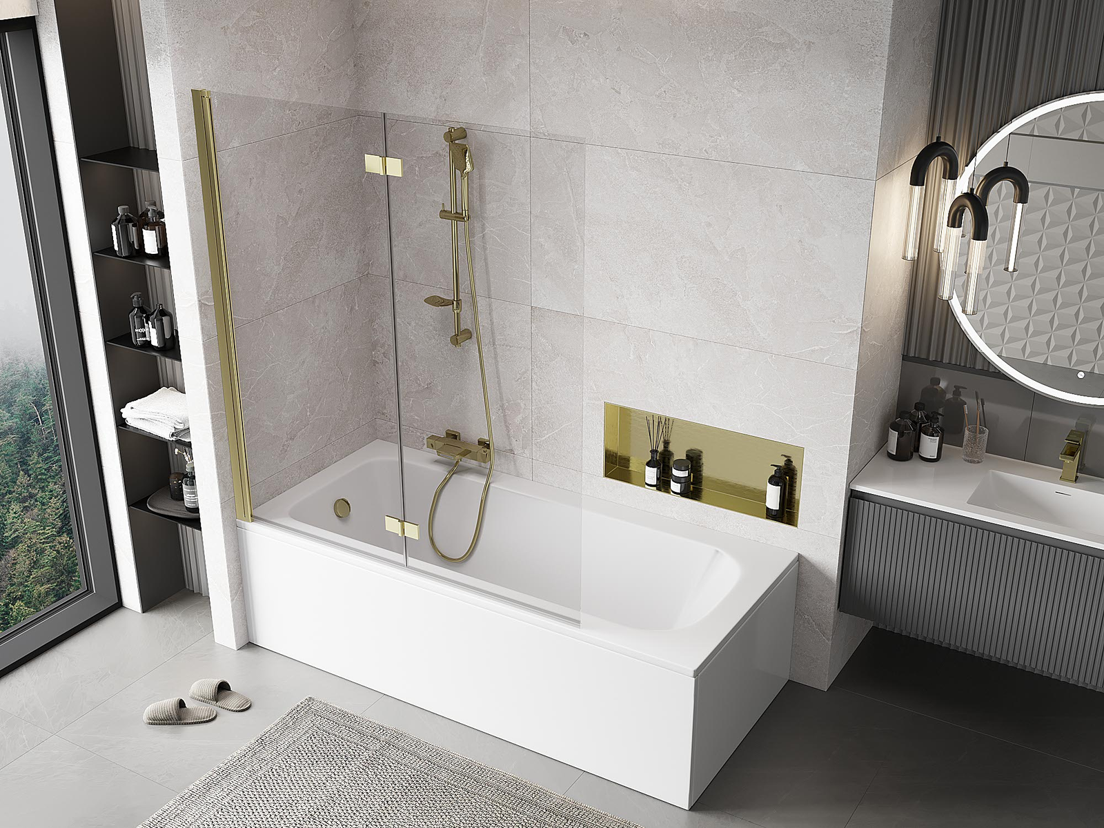 Két szárnyból készült paraván, amely összecsukható. Ez a megoldás több helyet takarít meg a fürdőszobában, és lehetővé teszi a fennmaradó tér szabad használatát, amikor nem használjuk a fürdőrészt.