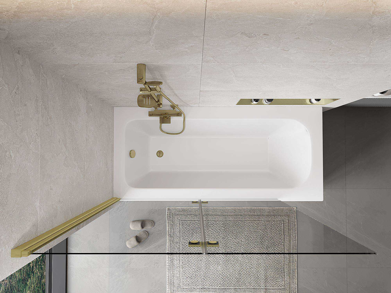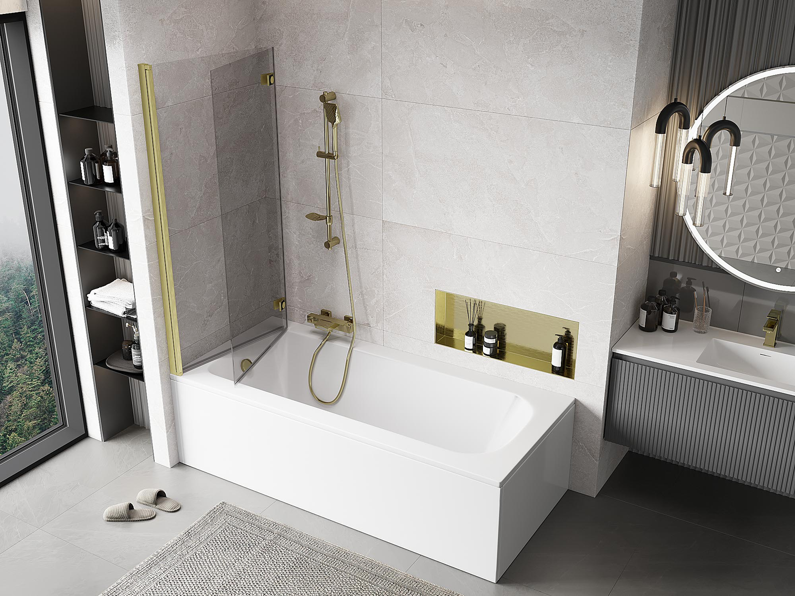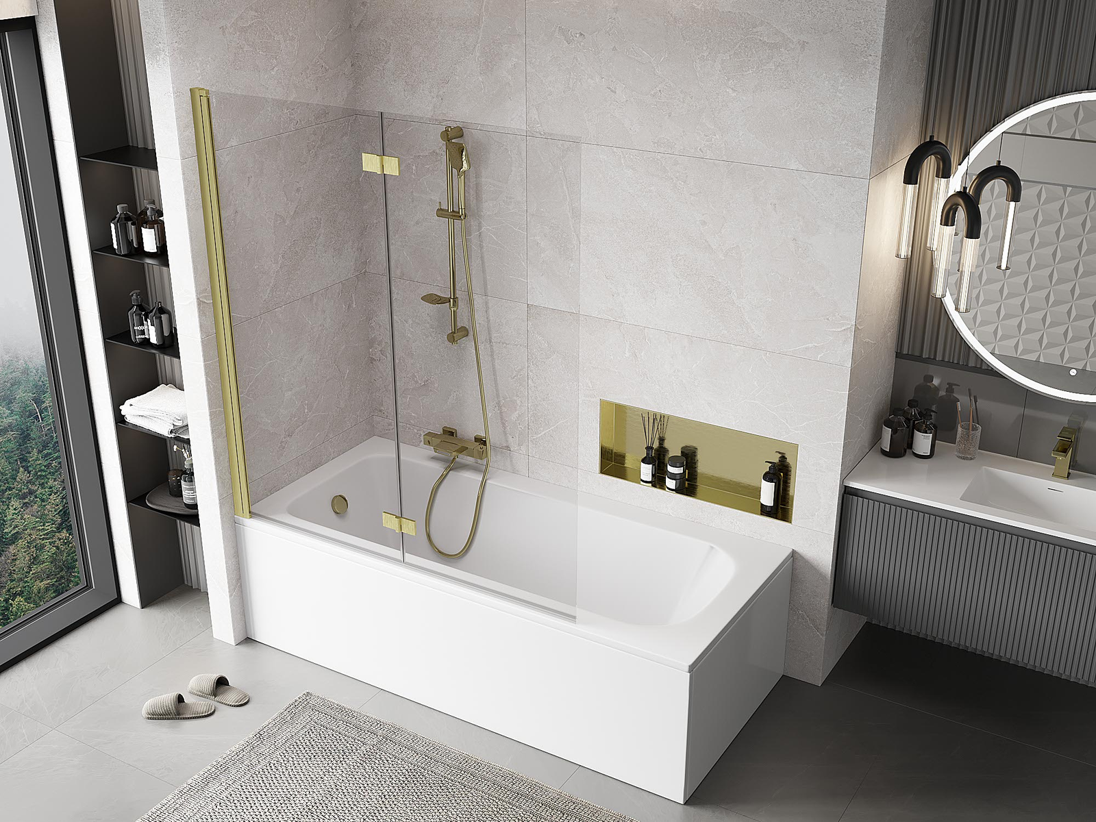 Két szárnyból készült paraván, amely összecsukható. Ez a megoldás több helyet takarít meg a fürdőszobában, és lehetővé teszi a fennmaradó tér szabad használatát, amikor nem használjuk a fürdőrészt.