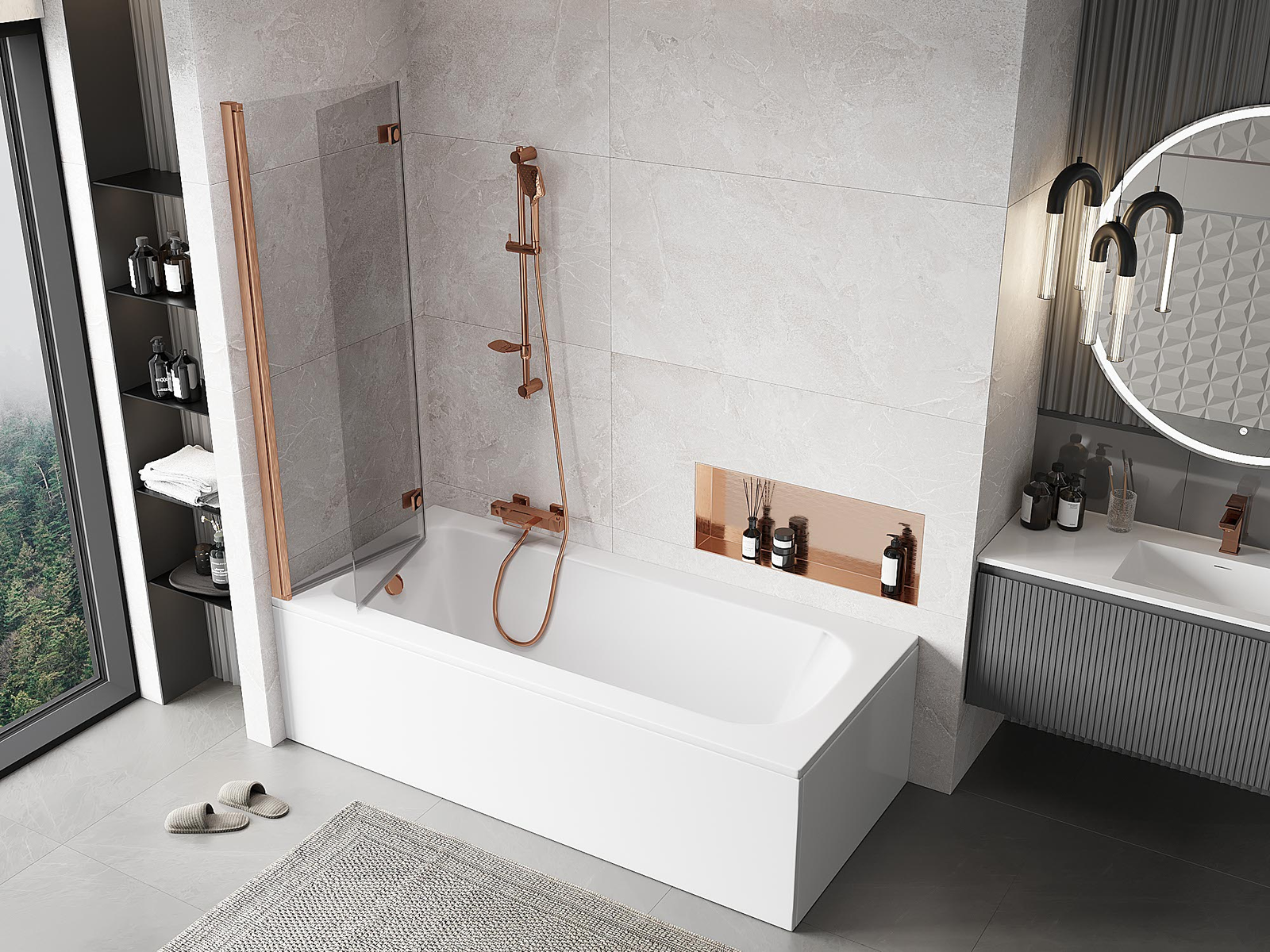 Két szárnyból készült paraván, amely összecsukható. Ez a megoldás több helyet takarít meg a fürdőszobában, és lehetővé teszi a fennmaradó tér szabad használatát, amikor nem használjuk a fürdőrészt.