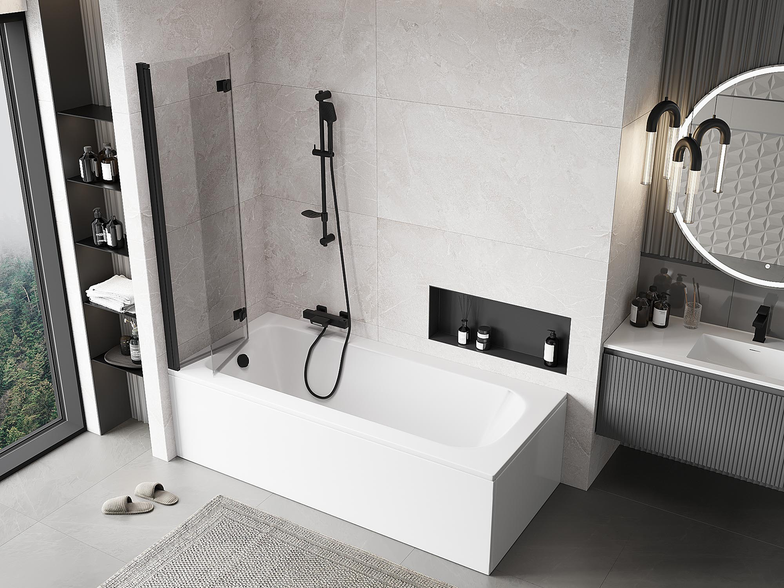 Két szárnyból készült paraván, amely összecsukható. Ez a megoldás több helyet takarít meg a fürdőszobában, és lehetővé teszi a fennmaradó tér szabad használatát, amikor nem használjuk a fürdőrészt.
