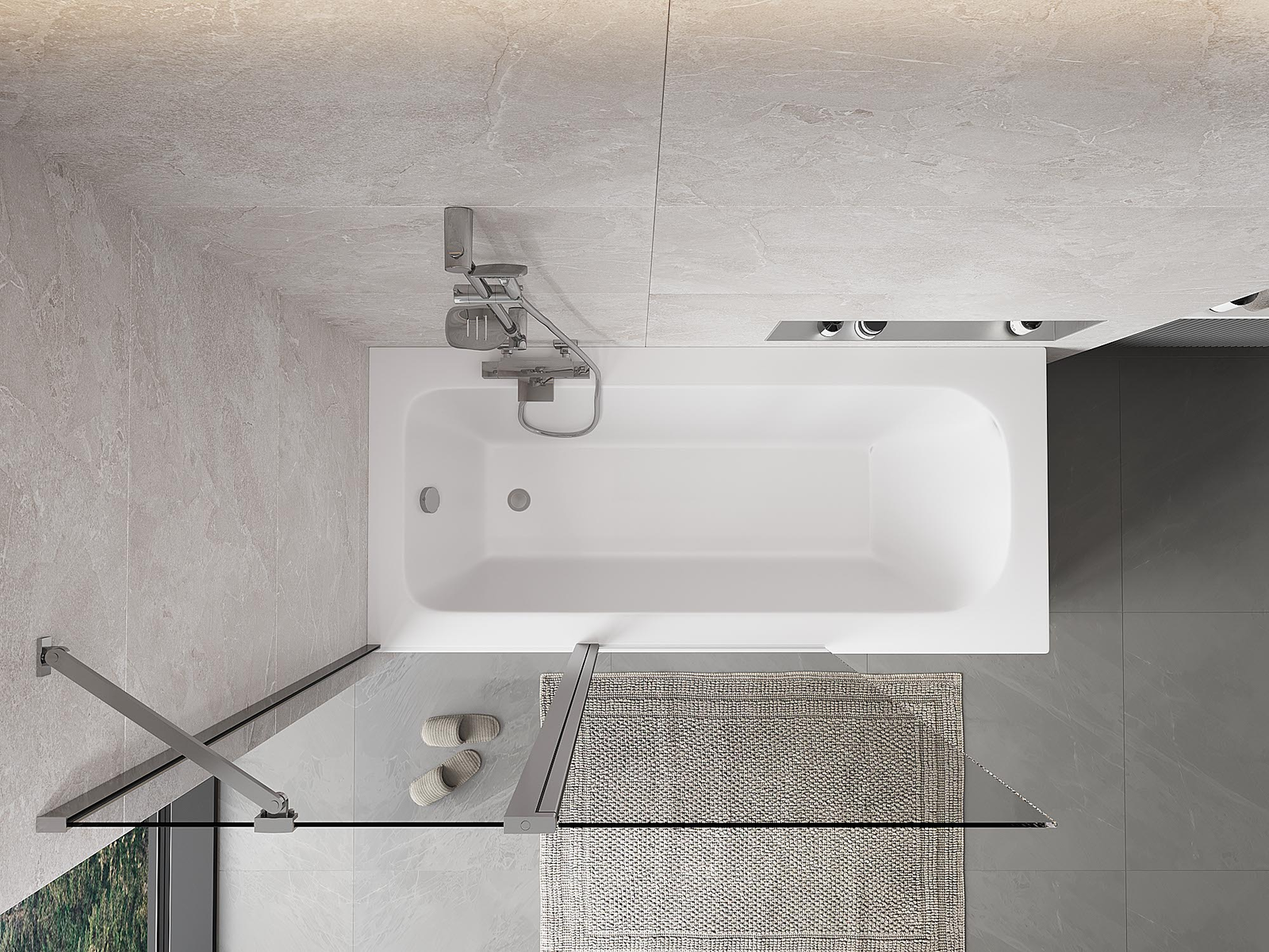 Két szárnyból készült paraván, amely összecsukható. Ez a megoldás több helyet takarít meg a fürdőszobában, és lehetővé teszi a fennmaradó tér szabad használatát, amikor nem használjuk a fürdőrészt.