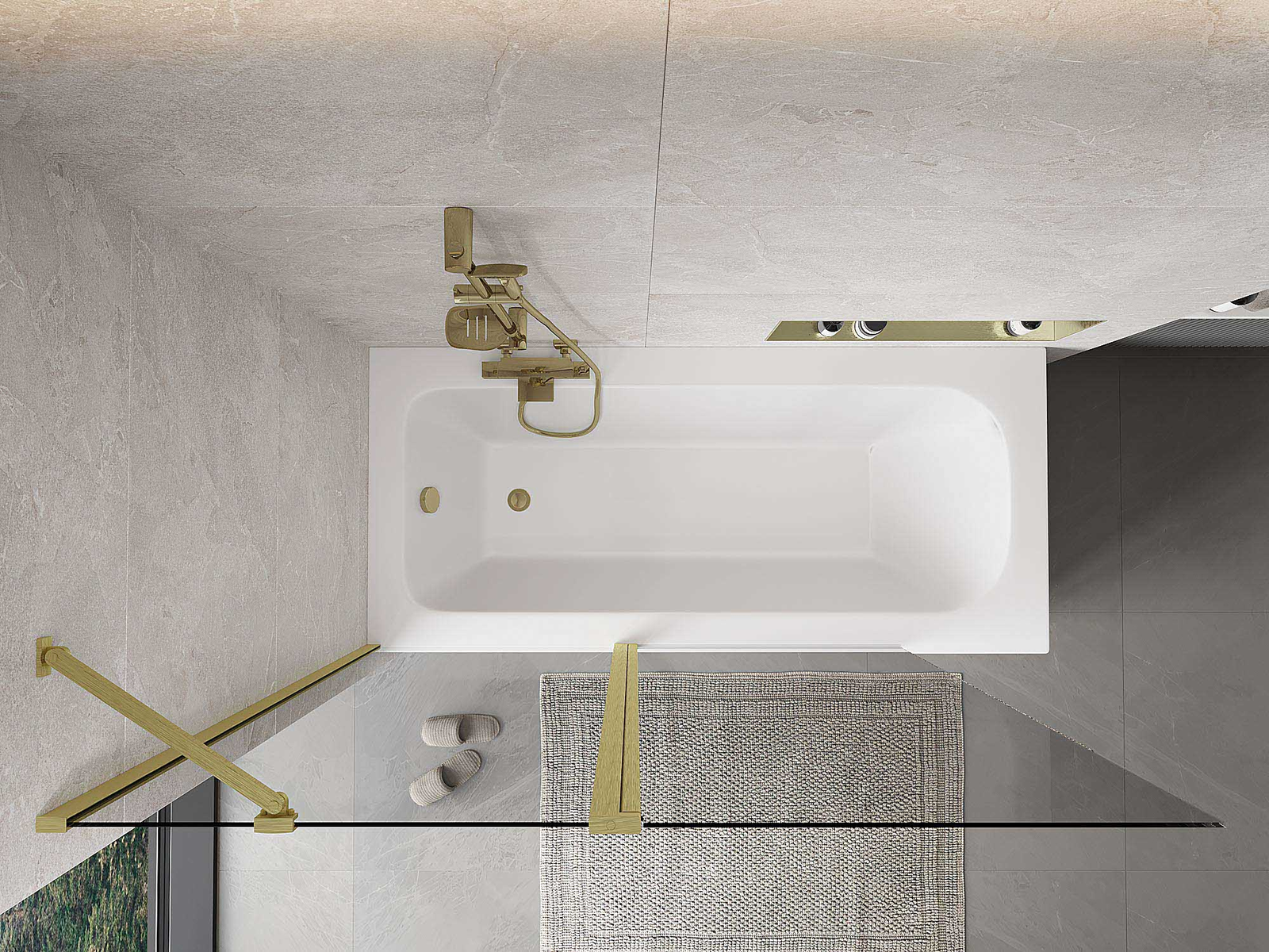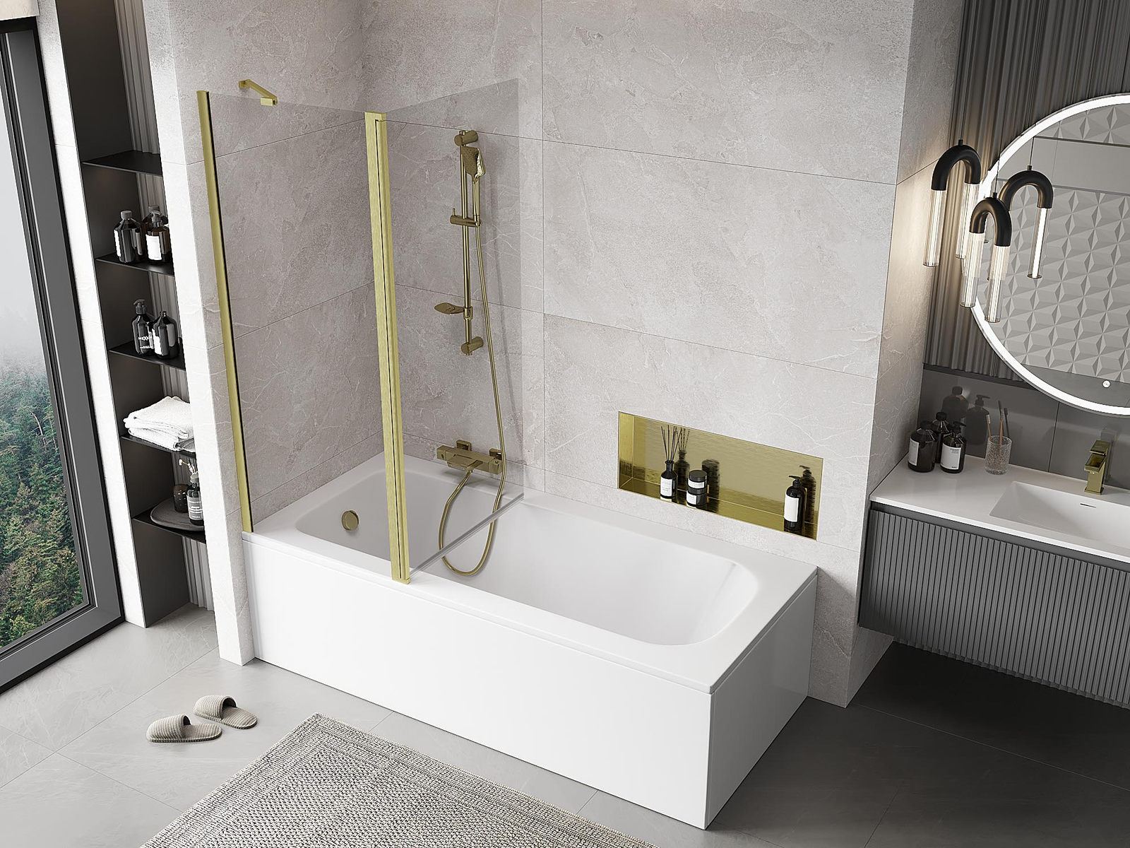 Két szárnyból készült paraván, amely összecsukható. Ez a megoldás több helyet takarít meg a fürdőszobában, és lehetővé teszi a fennmaradó tér szabad használatát, amikor nem használjuk a fürdőrészt.