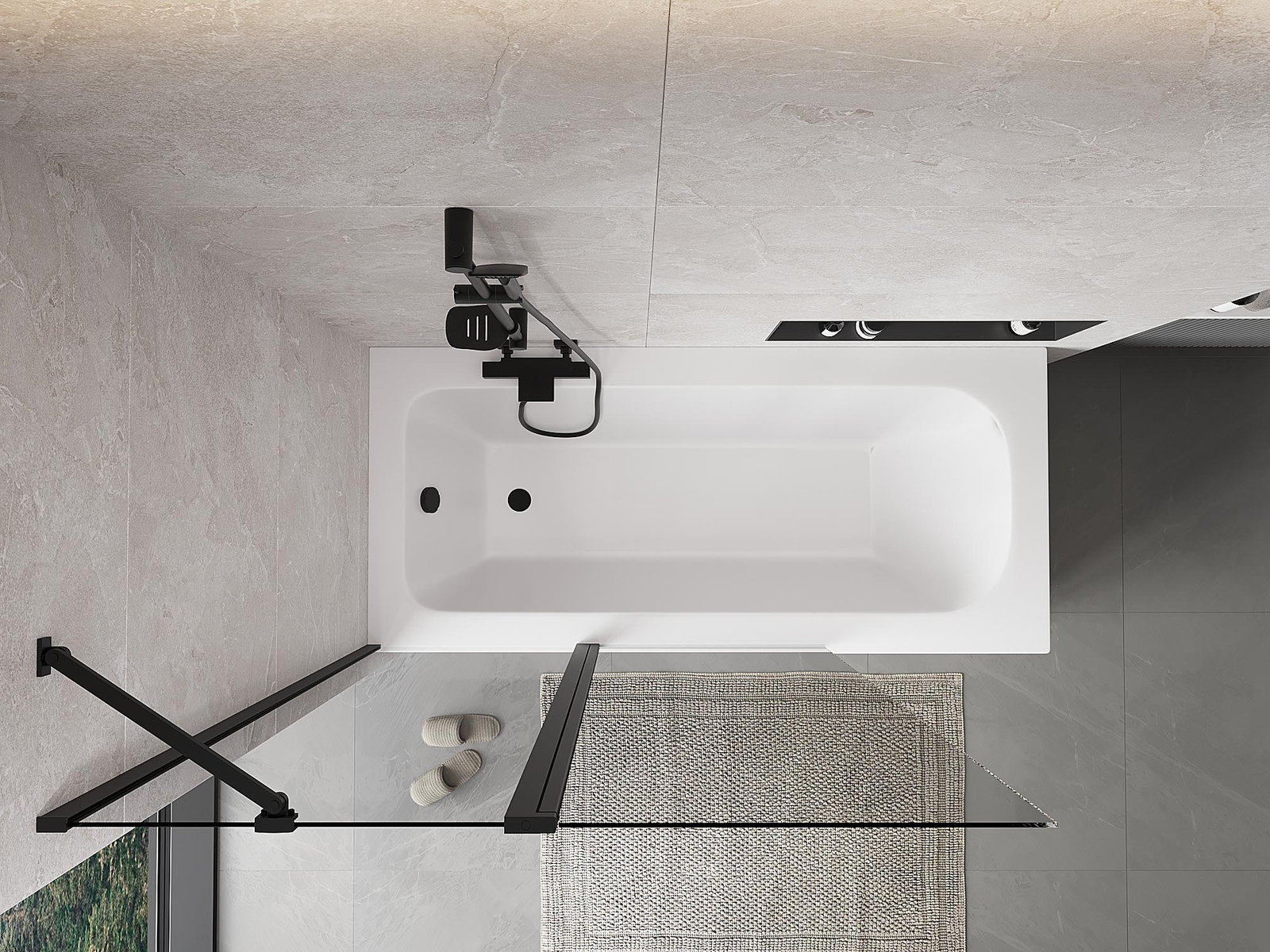 Két szárnyból készült paraván, amely összecsukható. Ez a megoldás több helyet takarít meg a fürdőszobában, és lehetővé teszi a fennmaradó tér szabad használatát, amikor nem használjuk a fürdőrészt.
