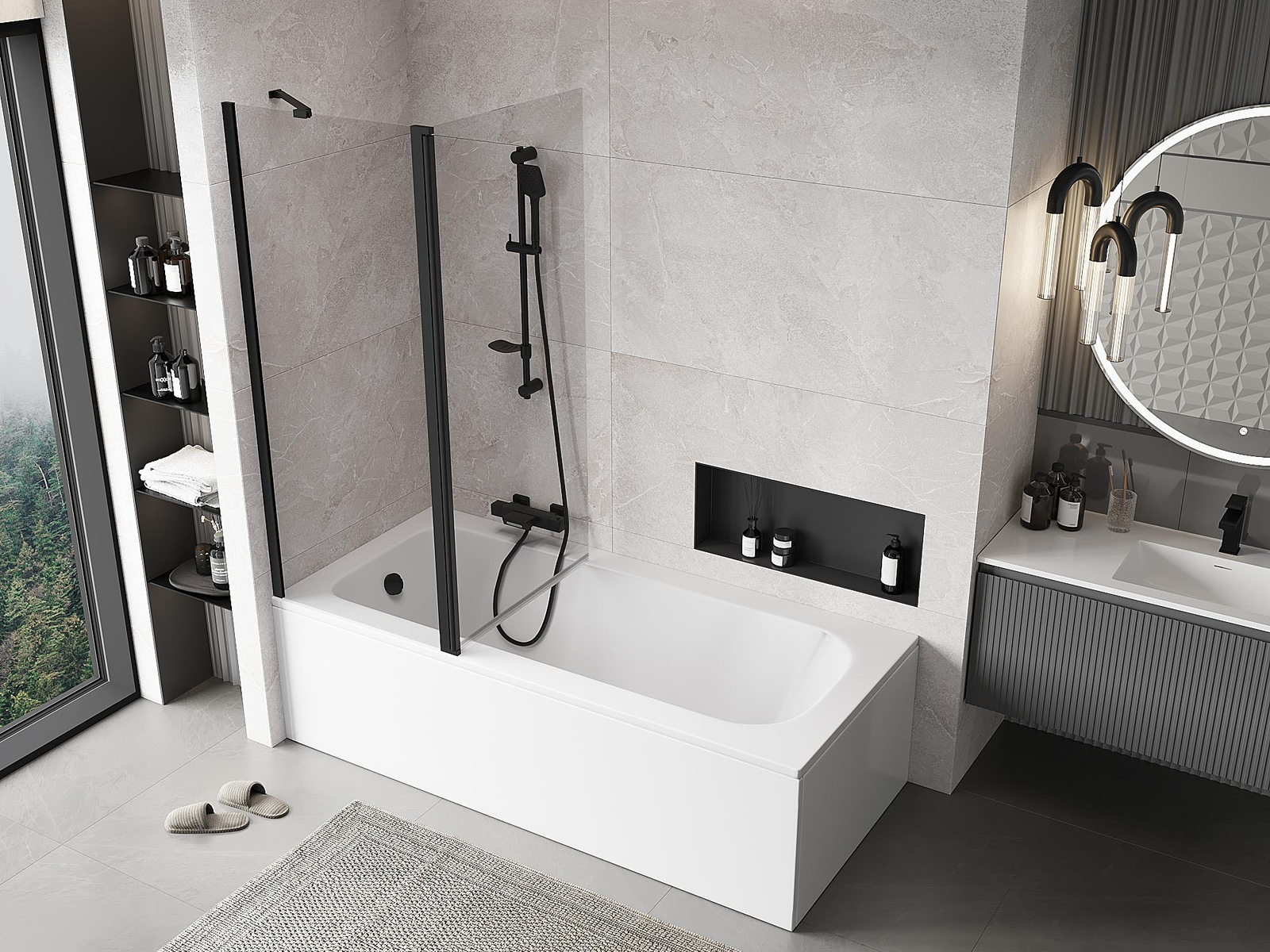 Két szárnyból készült paraván, amely összecsukható. Ez a megoldás több helyet takarít meg a fürdőszobában, és lehetővé teszi a fennmaradó tér szabad használatát, amikor nem használjuk a fürdőrészt.