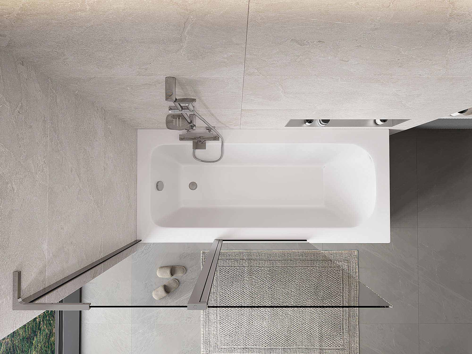 Két szárnyból készült paraván, amely összecsukható. Ez a megoldás több helyet takarít meg a fürdőszobában, és lehetővé teszi a fennmaradó tér szabad használatát, amikor nem használjuk a fürdőrészt.