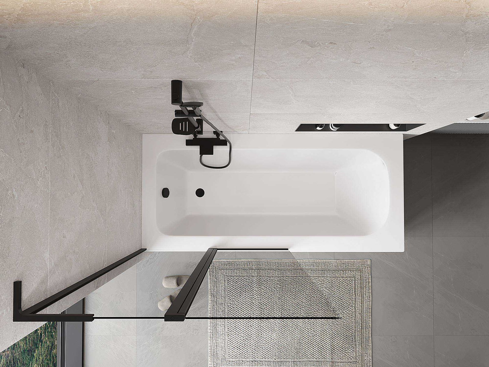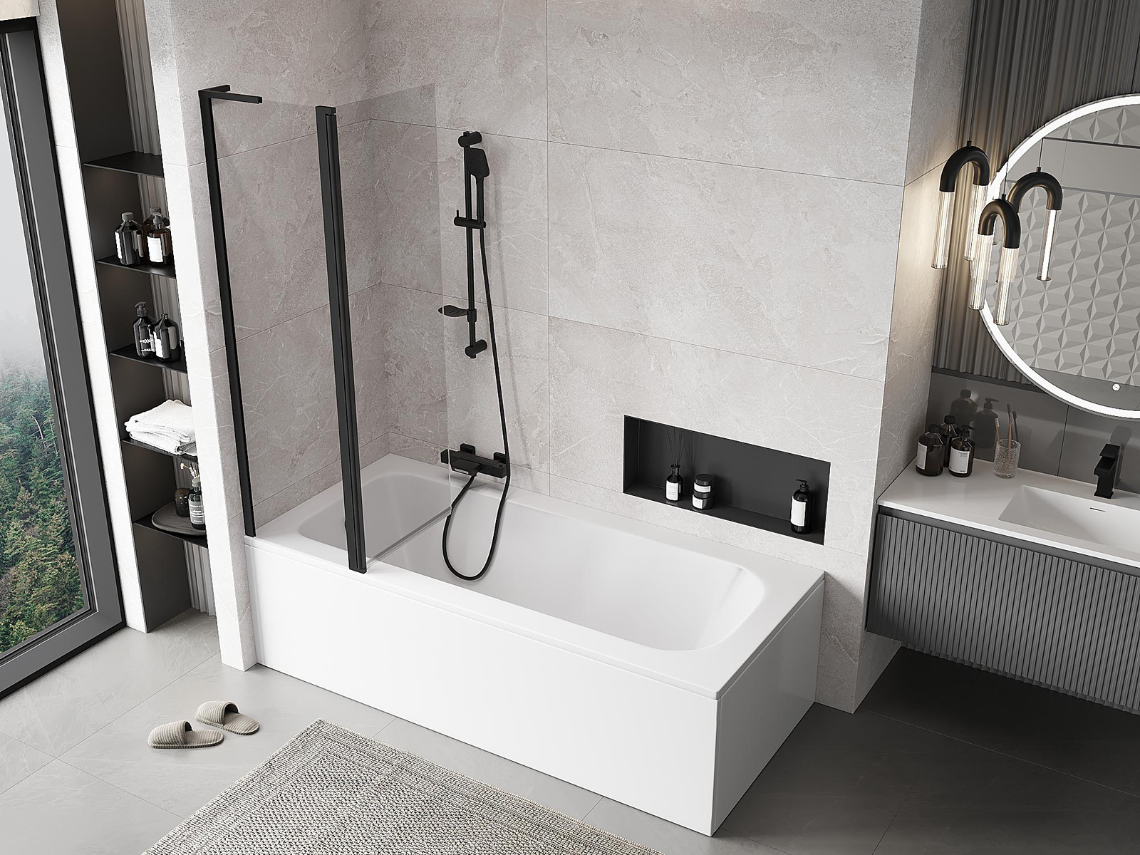 Két szárnyból készült paraván, amely összecsukható. Ez a megoldás több helyet takarít meg a fürdőszobában, és lehetővé teszi a fennmaradó tér szabad használatát, amikor nem használjuk a fürdőrészt.