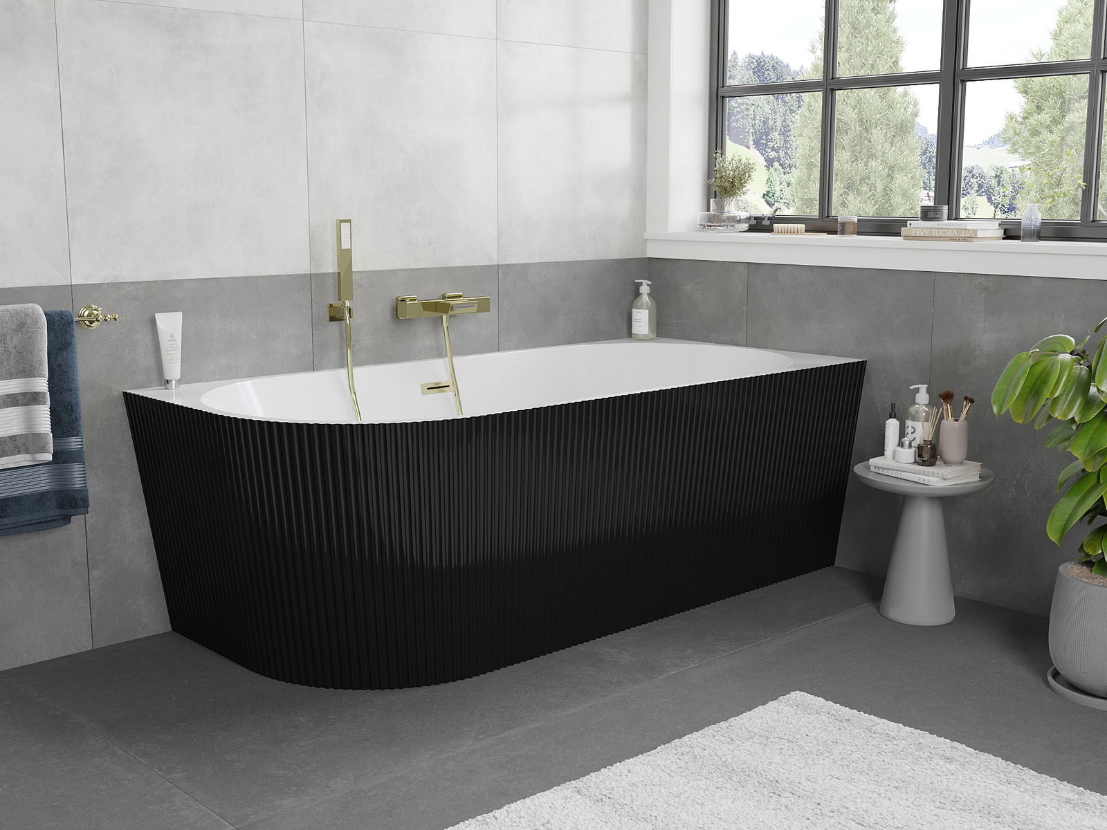Mexen Silo sarok szabadon álló kád jobb bordázott 170 x 80 cm, fehér/fekete, arany kefe túlfolyóval - 52891708075P-55