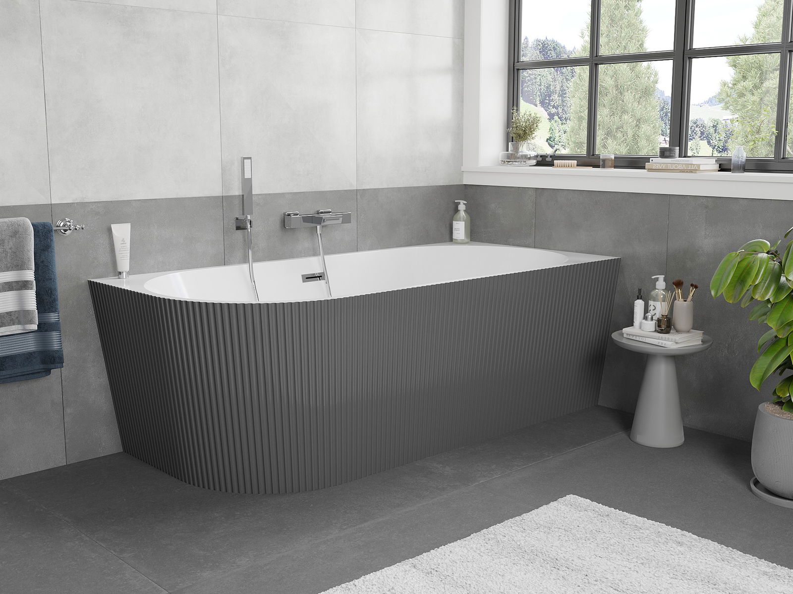 Mexen Silo szabadon álló akril fürdőkád jobb sarokelem 150 x 75 cm, fehér/szürke, króm túlfolyóval - 52891507562P-01