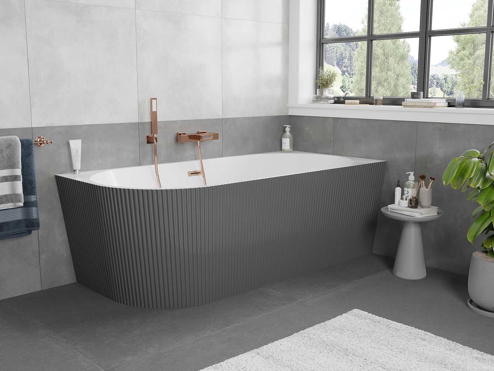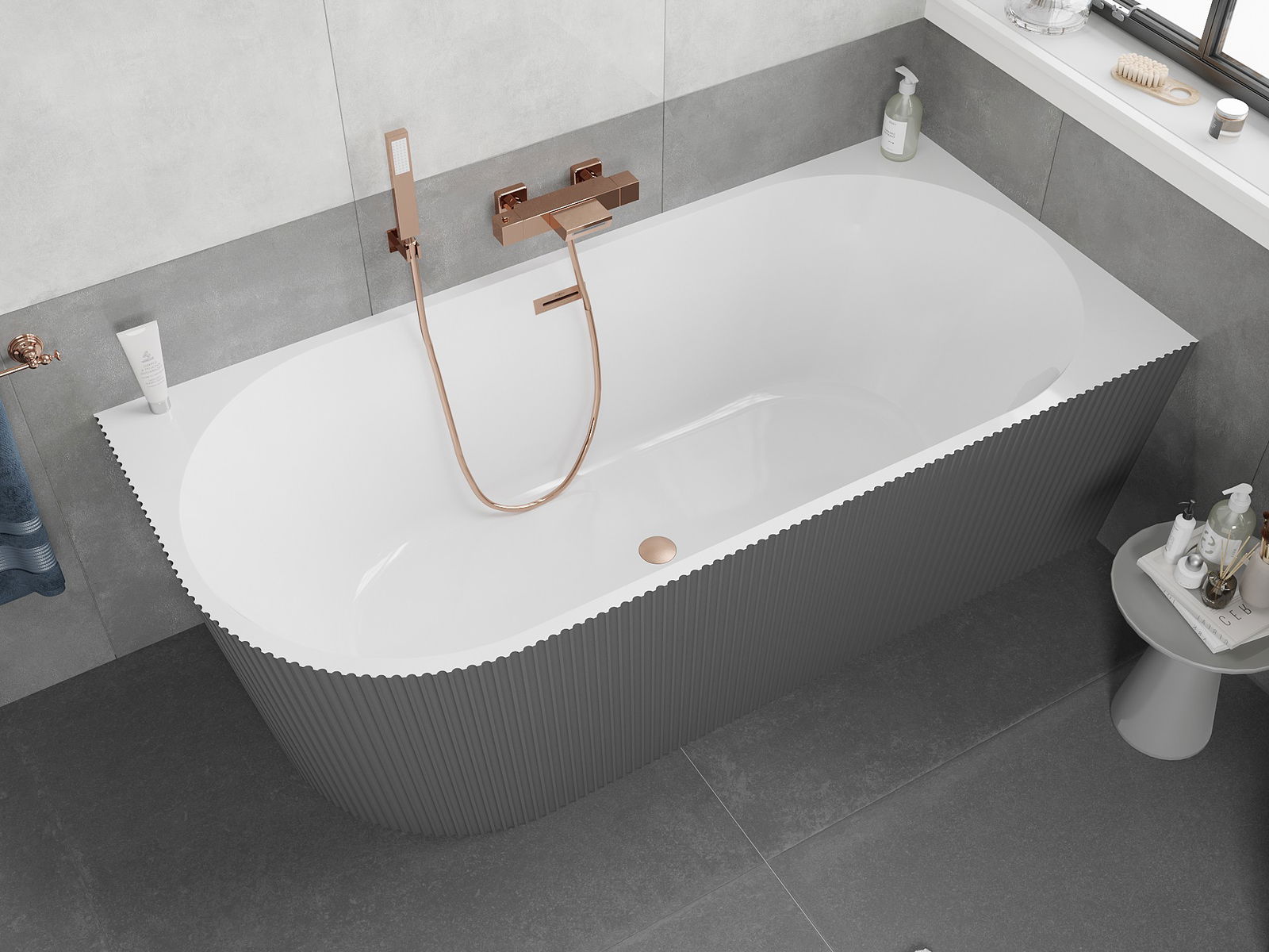 Mexen Silo szabadon álló sarokkád jobbos bordázott 170 x 80 cm, fehér/szürke, sörtézett réz túlfolyóval