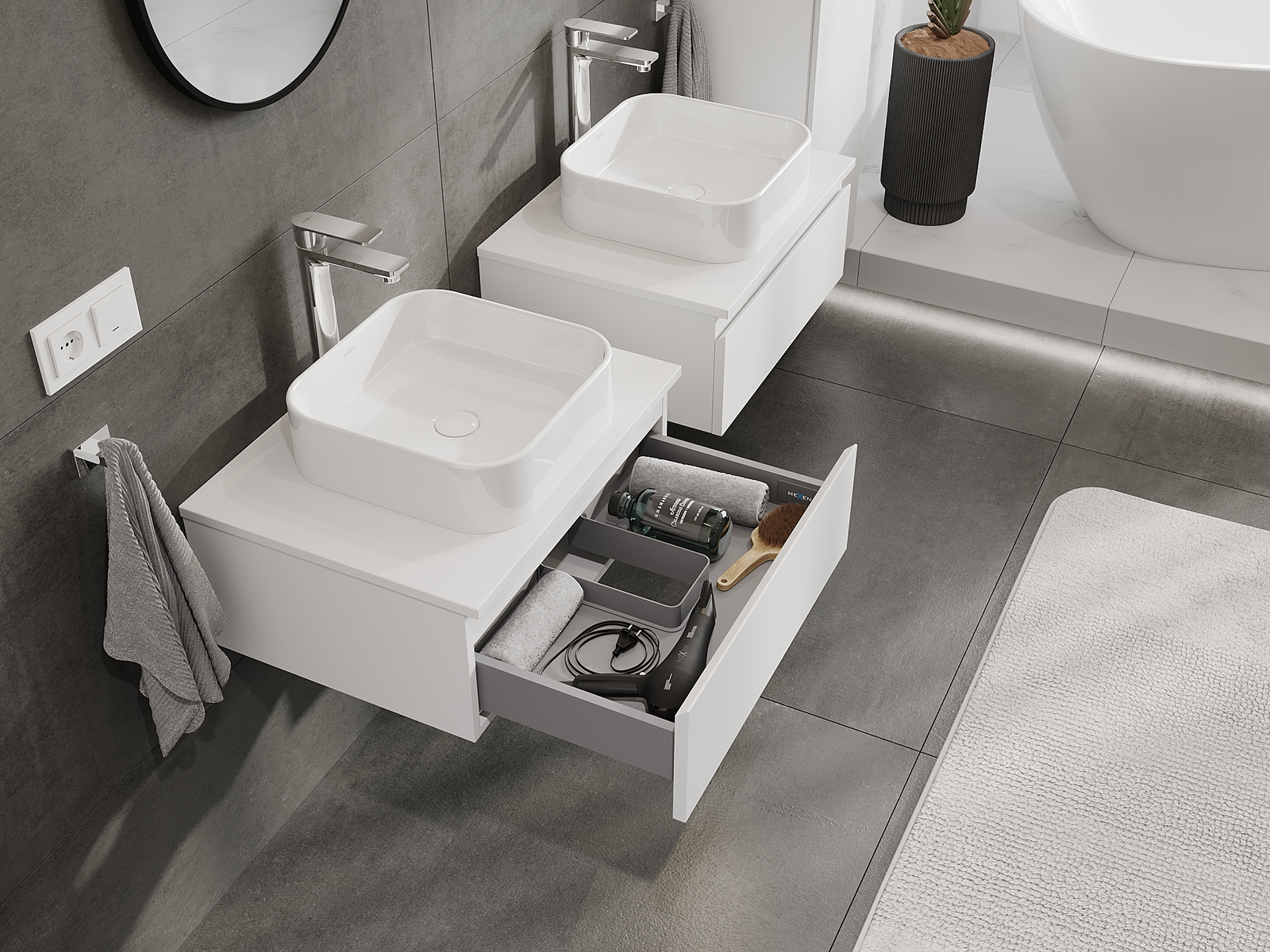 A moduláris fürdőszobabútorainkat különböző színkonfigurációkban lehet kombinálni, lehetővé téve a teljes személyre szabást. Kiválasztható mind az egyes elemek megjelenése, mind pedig funkciói, ami lehetővé teszi a bútorok személyes stílus- és használati preferenciákhoz való igazítását.