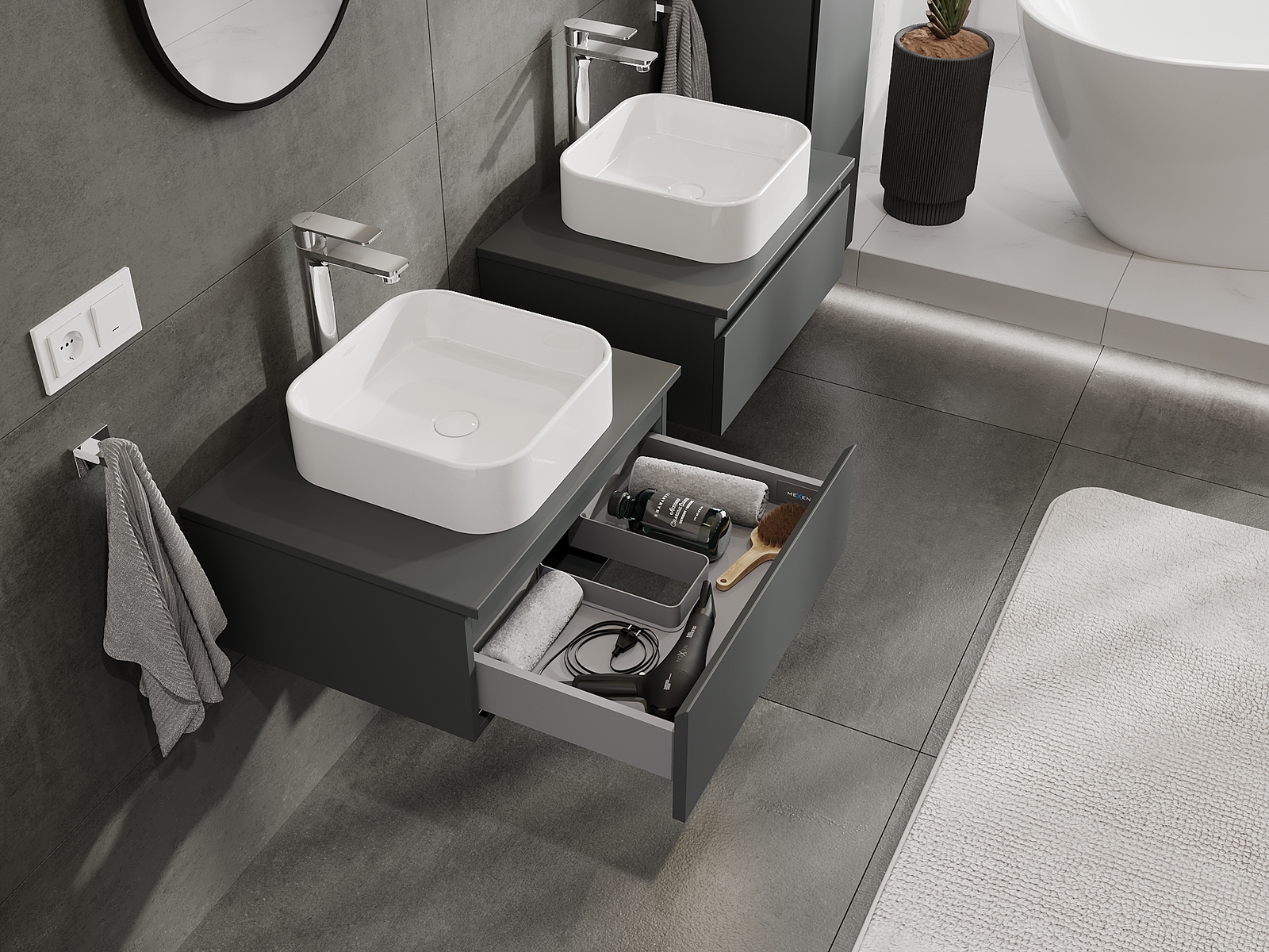A moduláris fürdőszobabútorainkat különböző színkonfigurációkban lehet kombinálni, lehetővé téve a teljes személyre szabást. Kiválasztható mind az egyes elemek megjelenése, mind pedig funkciói, ami lehetővé teszi a bútorok személyes stílus- és használati preferenciákhoz való igazítását.