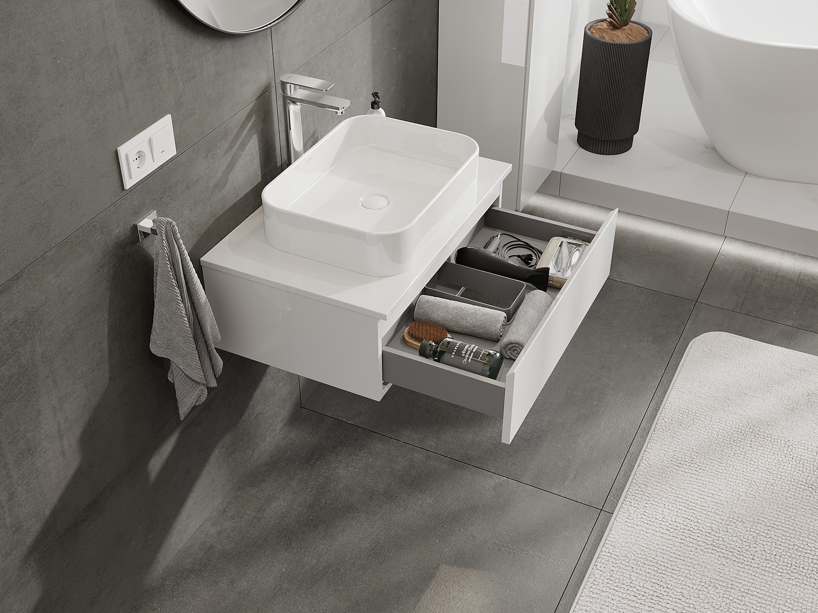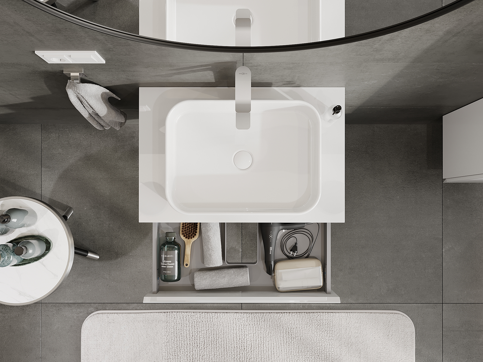 A fiókban lévő kivágás úgy van kialakítva, hogy befogadja a mosdó telepítéseknél szükséges szifont. Ennek köszönhetően a bútor teljesen funkcionálisan felszerelhető anélkül, hogy a fiók terének egy részét fel kellene áldozni a telepítés miatt.