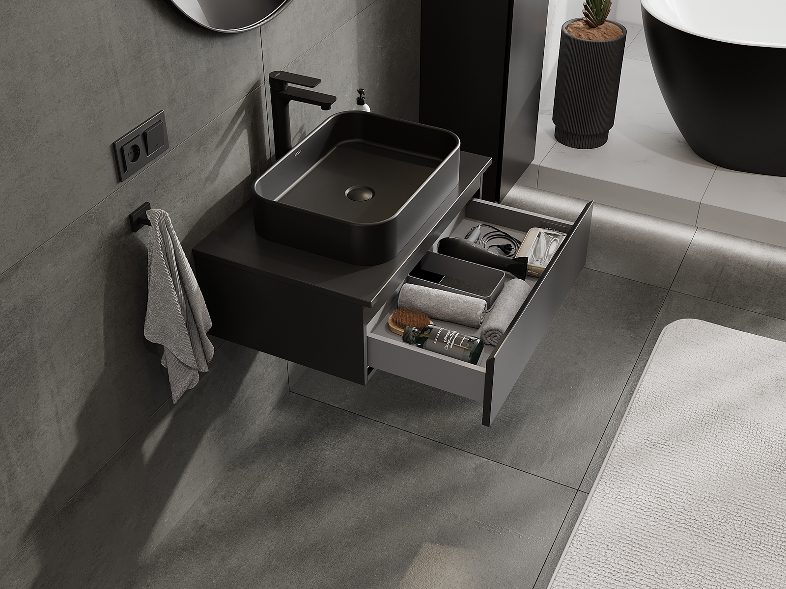 A fiókban lévő kivágás úgy van kialakítva, hogy befogadja a mosdó telepítéseknél szükséges szifont. Ennek köszönhetően a bútor teljesen funkcionálisan felszerelhető anélkül, hogy a fiók terének egy részét fel kellene áldozni a telepítés miatt.