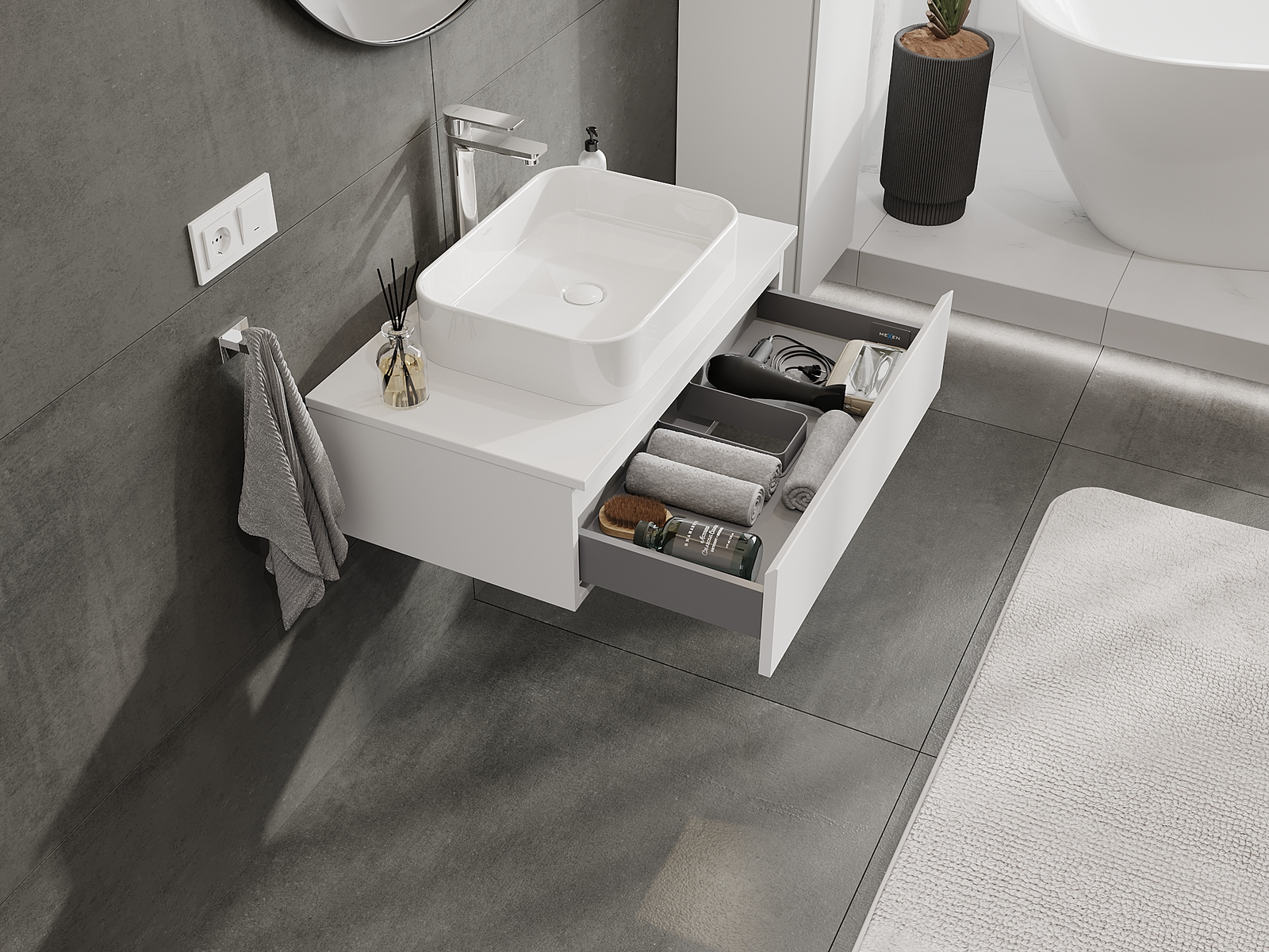 A fiókban lévő kivágás úgy van kialakítva, hogy befogadja a mosdó telepítéseknél szükséges szifont. Ennek köszönhetően a bútor teljesen funkcionálisan felszerelhető anélkül, hogy a fiók terének egy részét fel kellene áldozni a telepítés miatt.