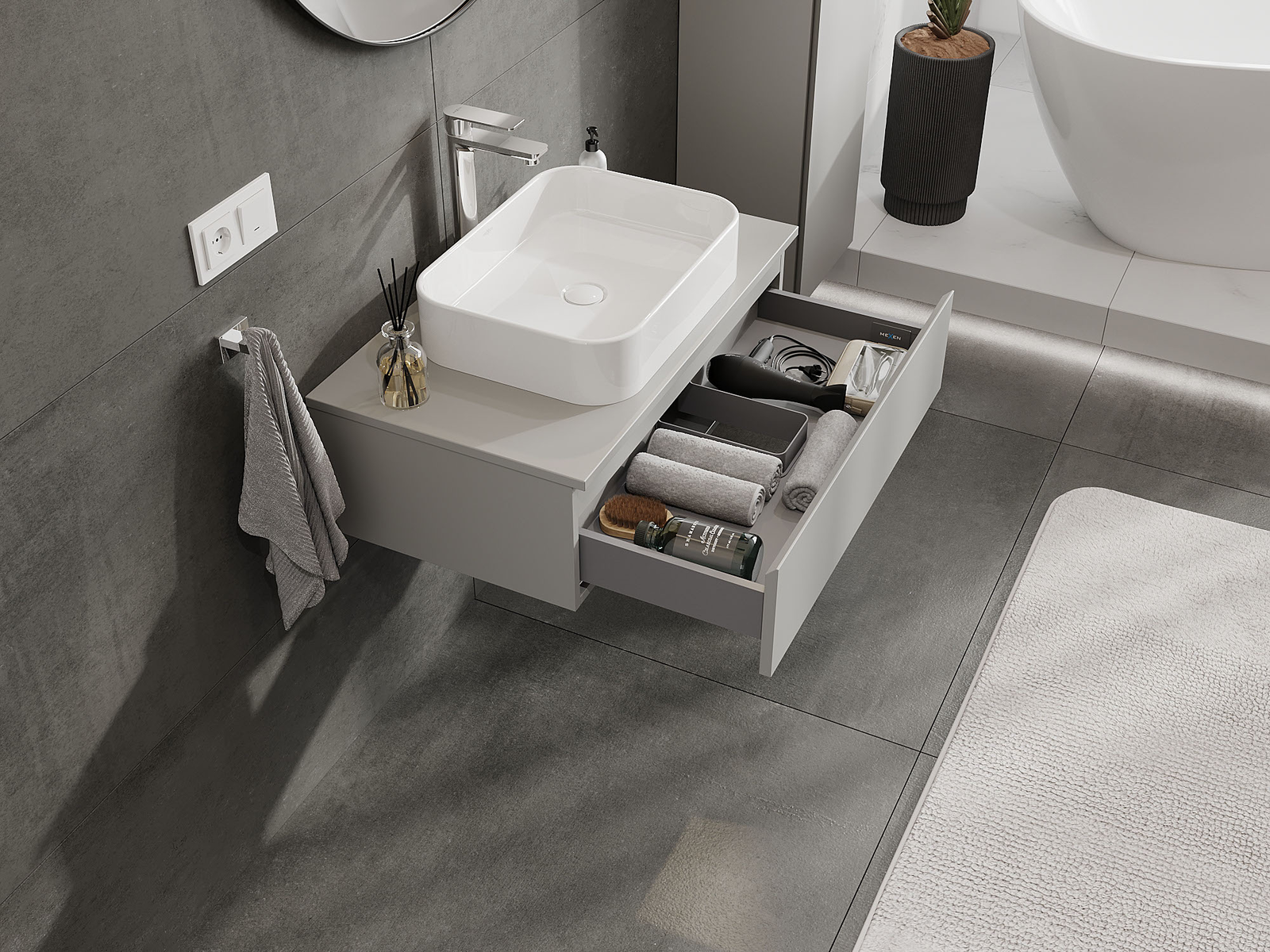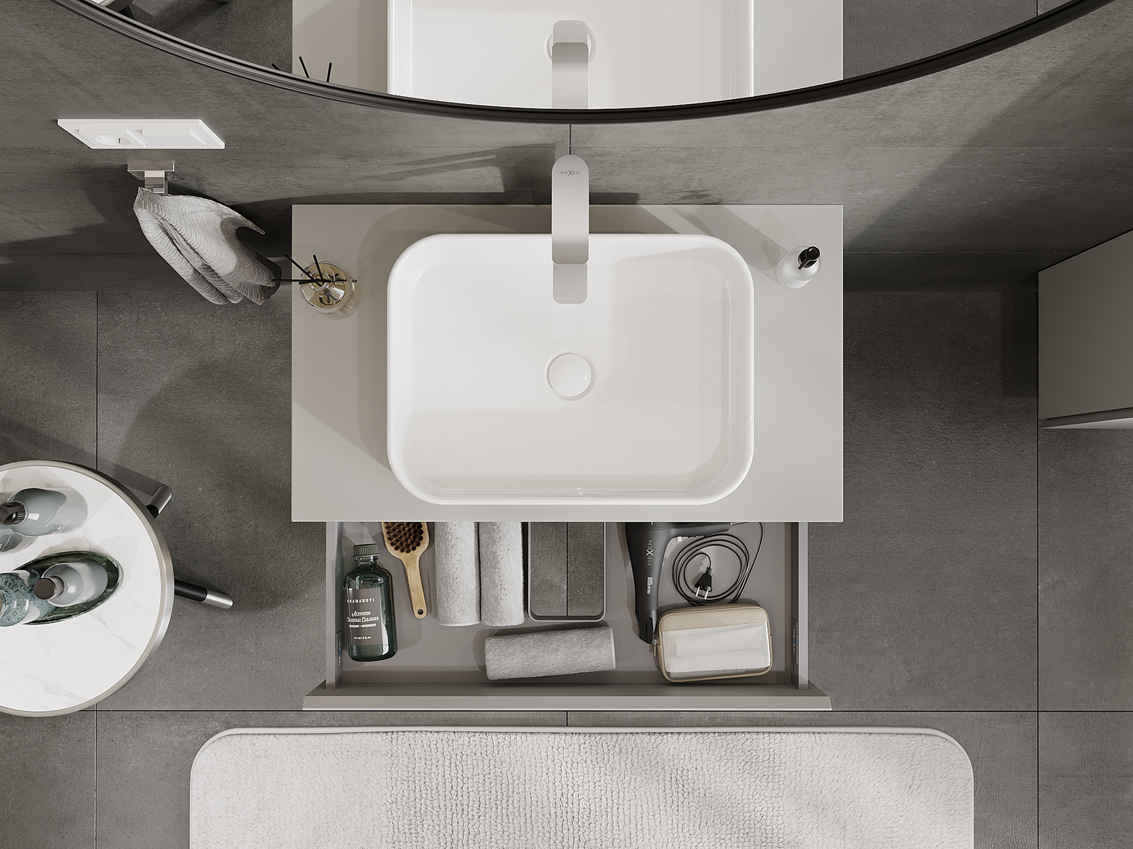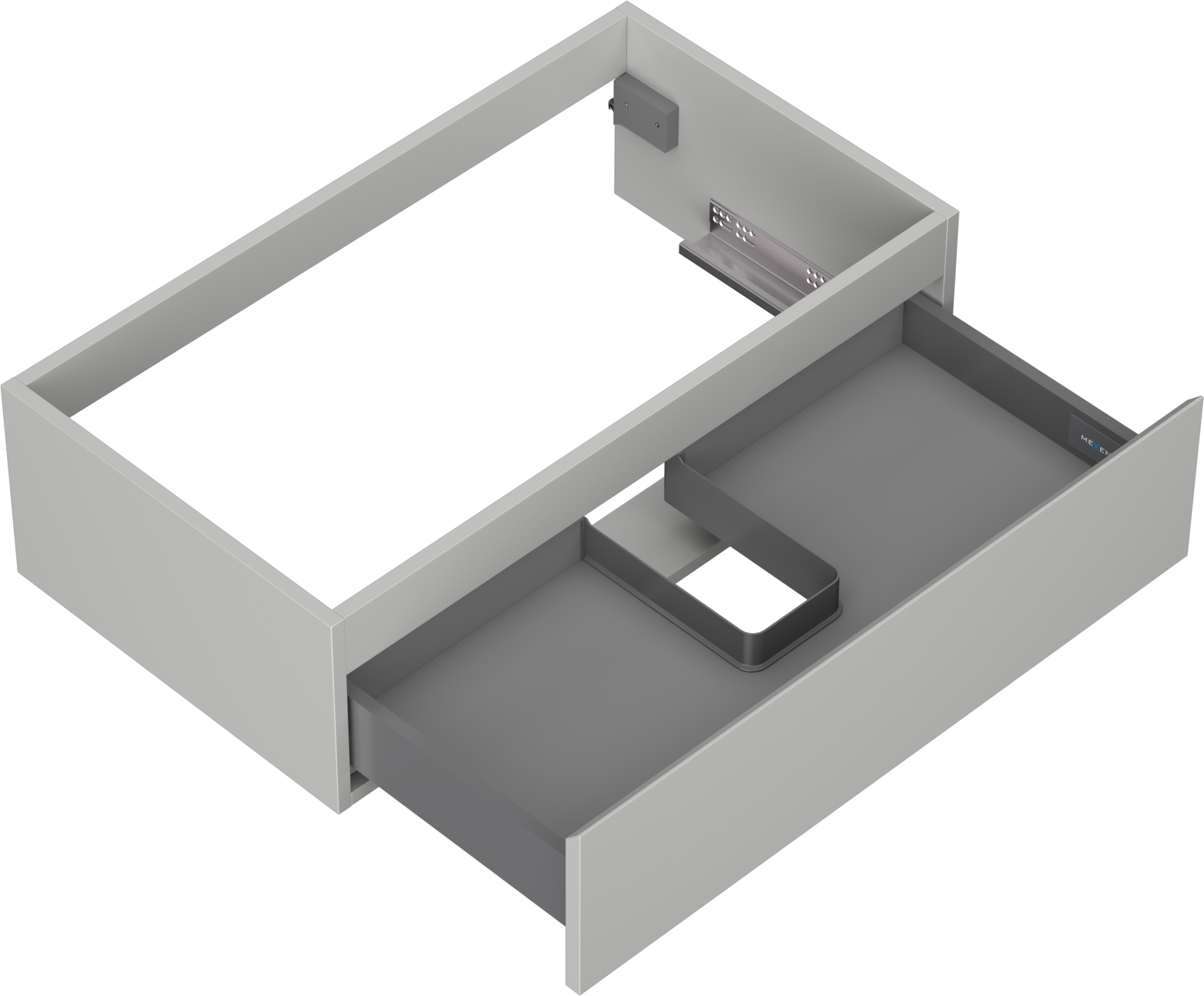 A fiókban lévő kivágás úgy van kialakítva, hogy befogadja a mosdó telepítéseknél szükséges szifont. Ennek köszönhetően a bútor teljesen funkcionálisan felszerelhető anélkül, hogy a fiók terének egy részét fel kellene áldozni a telepítés miatt.